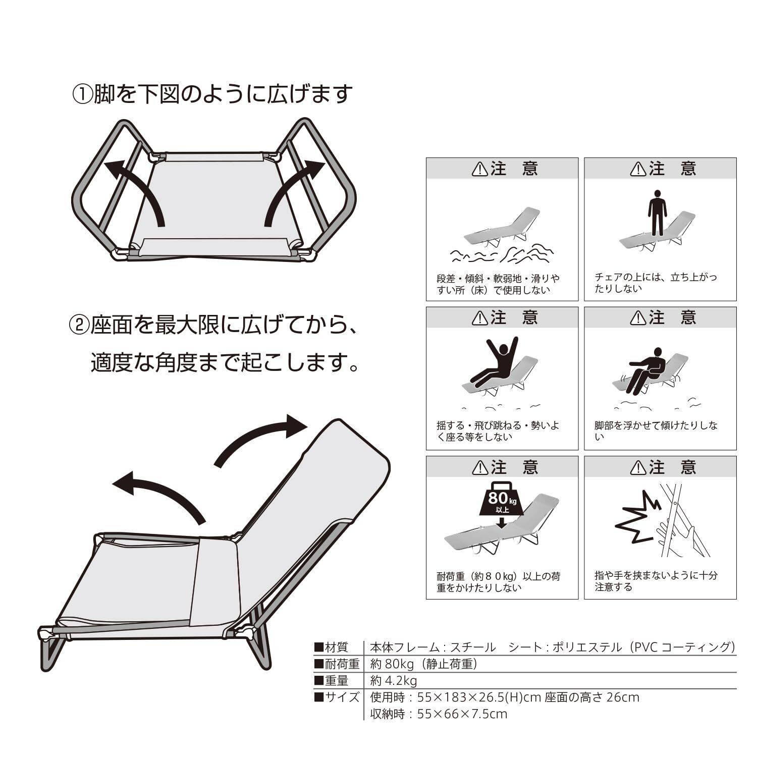 サイズ(約):1830x550x265mm 座面の高さ260mm 収納時660x550x75mm