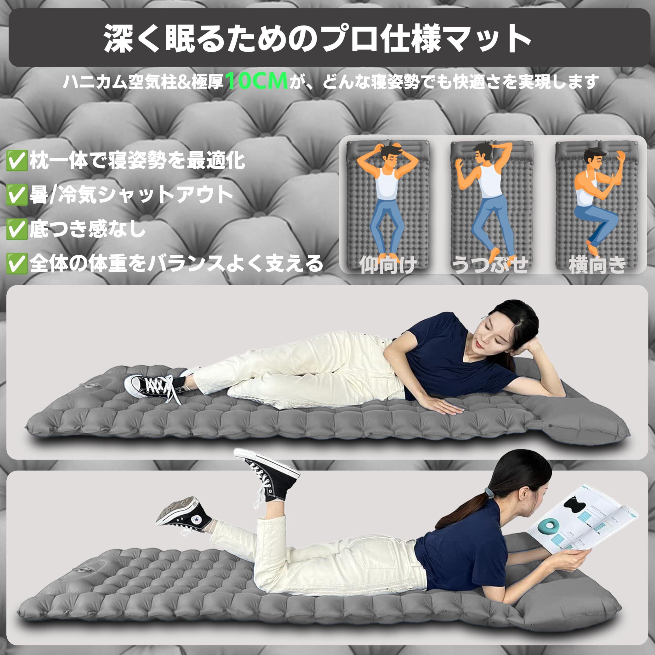【数量限定】強化版!エアーマット キャンプ マット ダブル【10cm極厚・耐荷重300kg・高R値4.0】足踏み式 耐穿刺/抗菌防撥水/二人用 人間工学枕付き 超軽量 膨らみやすい 寝心地良い 幅広設計 コンパクト 簡単収納 車中泊/防災/登山/テント/カップル対応 補修テープ&収納袋付&日本語説明書
