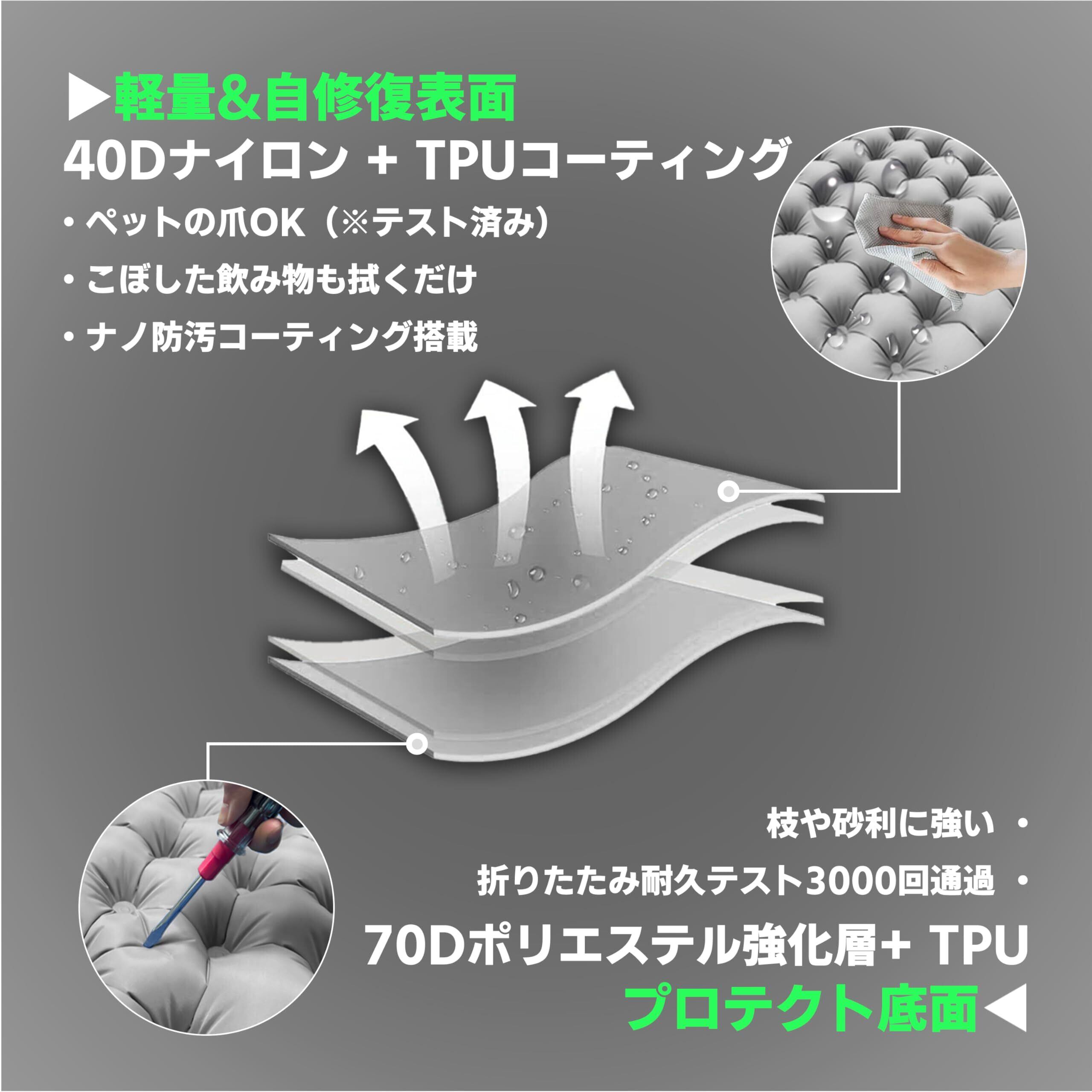 【軍用級素材・耐穿刺300kg・防水防汚で耐久性抜群】 表面は40Dナイロン+TPU防水コーティング、底面は70Dポリエステルの軍用級素材を採用。鋭利な枝や砂利への耐穿刺性に優れ、耐摩耗試験3000回突破。エアーマット 耐荷重は最大300kgで、カップルや家族での使用も安心。抗菌防撥水加工で飲み物こぼれも拭くだけ、清潔をキープ。アウトドア用品として過酷な環境でも耐久性を発揮。テント マットとしても車中泊 マットレスとしても長期間使用可能。