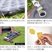 【コンパクト&軽量なエアーマット】 ファミリーキャンプから登山やツーリングキャンプにも。ザックに入るコンパクト&軽量なエアーマットの登場です。10回ほど空気を吹き込むだけで簡単に膨らますことが可能。長さ190cmもあるので大柄の男性もゆったり使用できます。