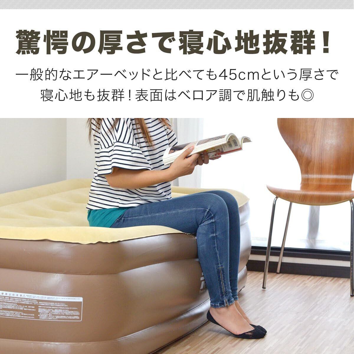 【驚愕の厚さ45cmで寝心地も抜群】 このエアーベッドの特徴は電動ポンプだけではありません。一般的なエアーベッドと比べても、45cmという驚きの厚さで寝心地は抜群です。さらに表面はベロア調になっているので、気持ちいい肌触りを得られます。