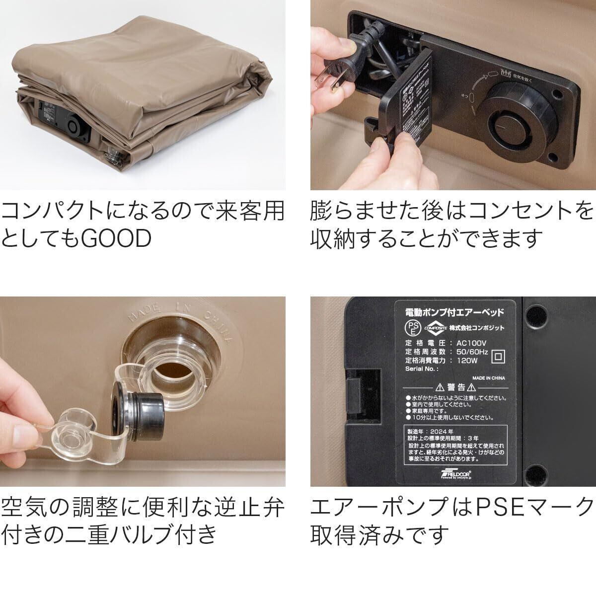【商品詳細】 ■サイズ:(約)幅100cm×長さ190cm×厚さ45cm シングルサイズ■材質:PVC(ポリ塩化ビニル) 表面フロック仕上げ・ABS樹脂■重量:(約)4.4kg■耐荷重:150kg■電源:100V 50/60Hz■消費電力:80/95W■電源コード:(約)1.4m■膨らむまでの目安:(約)1分10秒■付属品:エアーベッド本体、日本語取扱説明書、書■特記事項:※本商品はPVC(ポリ塩化ビニール)を使用しております。材質の特性上、接触・摩擦による他製品への色移り、または本商品への色移りすることがありますのでご注意ください。※エアーベッド本体の穴、空気漏れは対象外です。■PSマークの種類:PSE/届出事業者名:株式会社コンポジット■※商品は、モニターによって色合いが異なって見える場合があります。 また、仕様・デザインは改良のため予告なく変更することがあります。