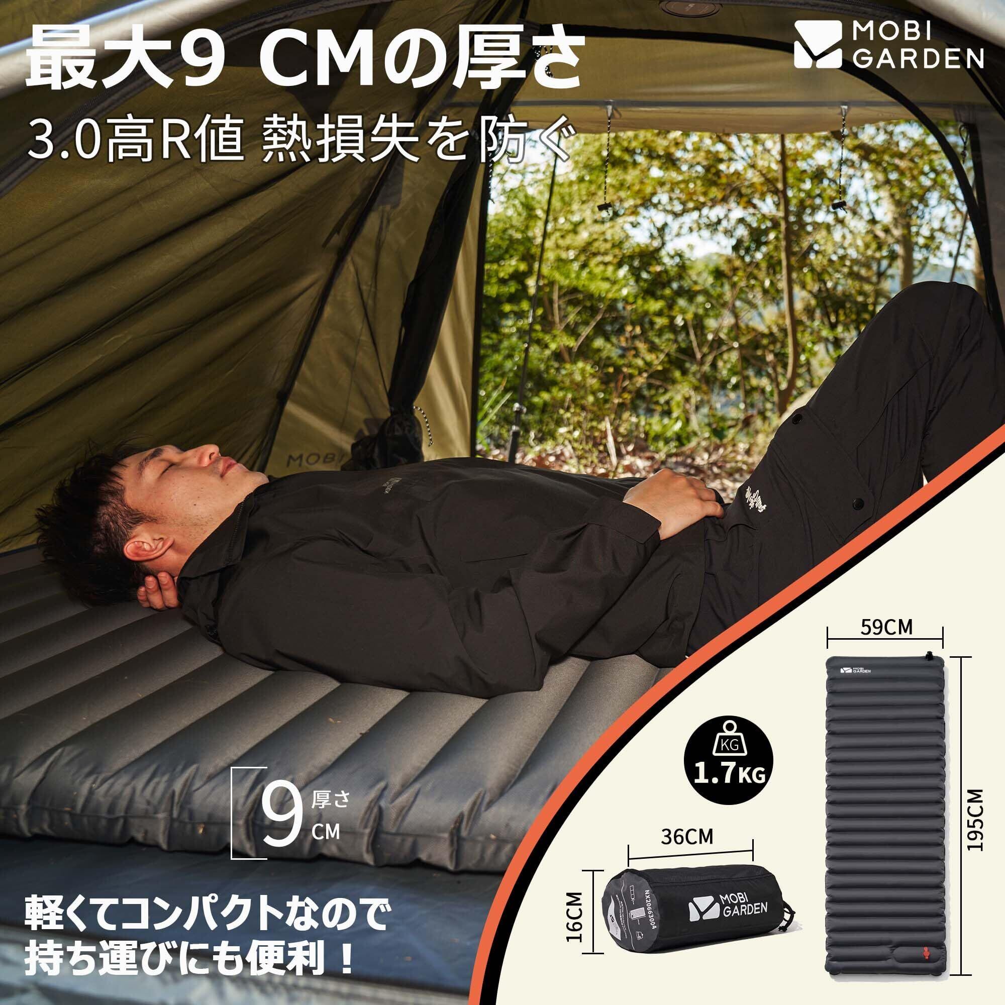 【人間工学設計・厚さ9CMで快適睡眠を楽しむ】MOBI GARDENエアーマットは独特な人間工学に基ついたデザインで、 体の曲線部位に絶妙にフィットし、圧力が分散され、やわらかな寝心地が魅力です。キャンプマットなどで使えば、地面の凹凸や硬い岩から身体を守って快適な睡眠を確保できます。サイズは長さ195cm×幅59cm×厚さ9cm+最大耐荷重は約200kgで、大人でもゆったり足を延ばして寝ることができます。厚さは9cmあり、地面からの冷気もしっかりシャットアウトできます。