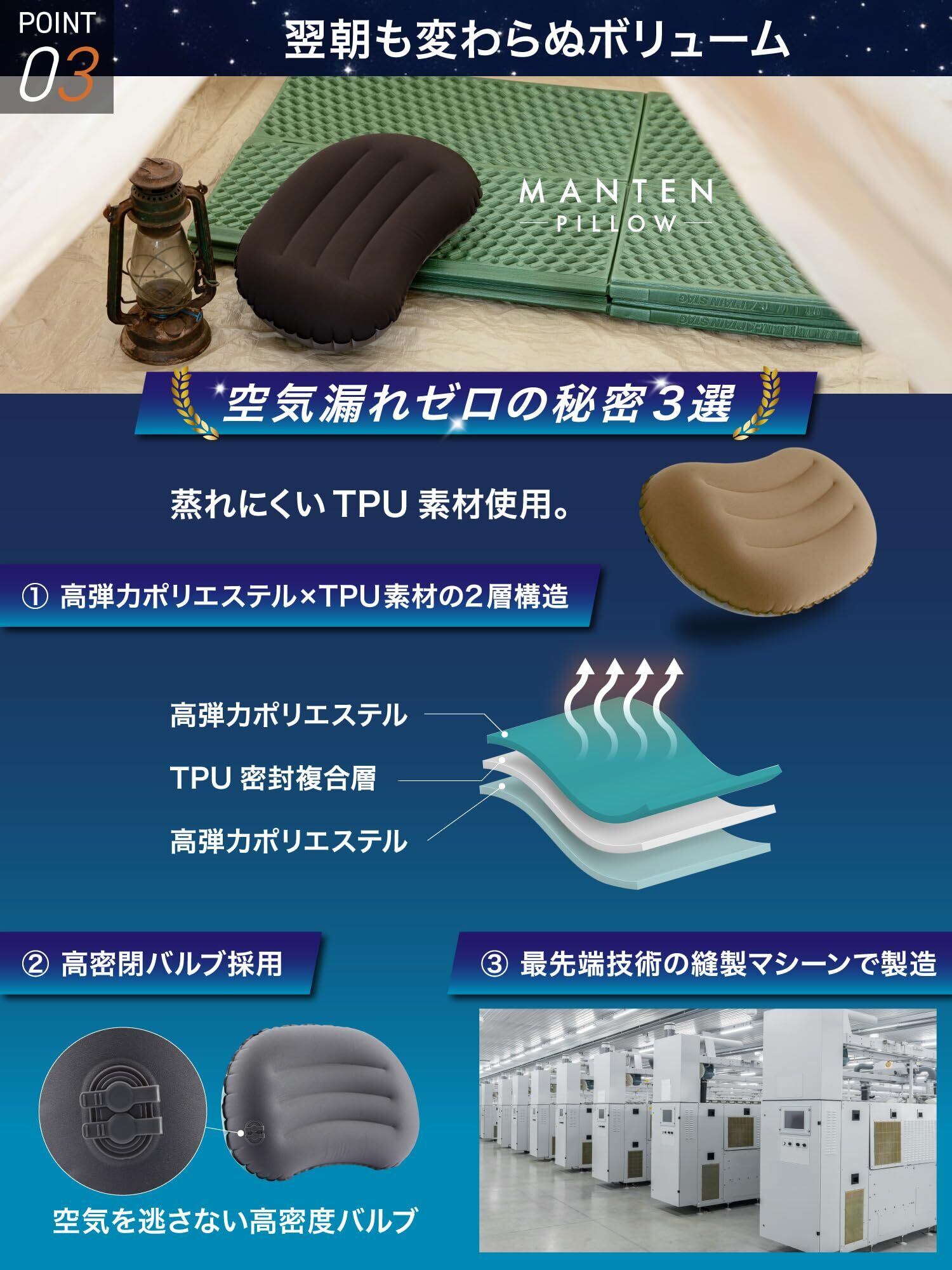 ■【快適な使い心地を追求したデザイン!】高品質な素材を使用した満天ピローは、頭や首を優しく支え、体圧を分散します。エアーによる柔らかなフィーリングが実現されており、アウトドアでも自宅のようなリラックス感を得られます。
