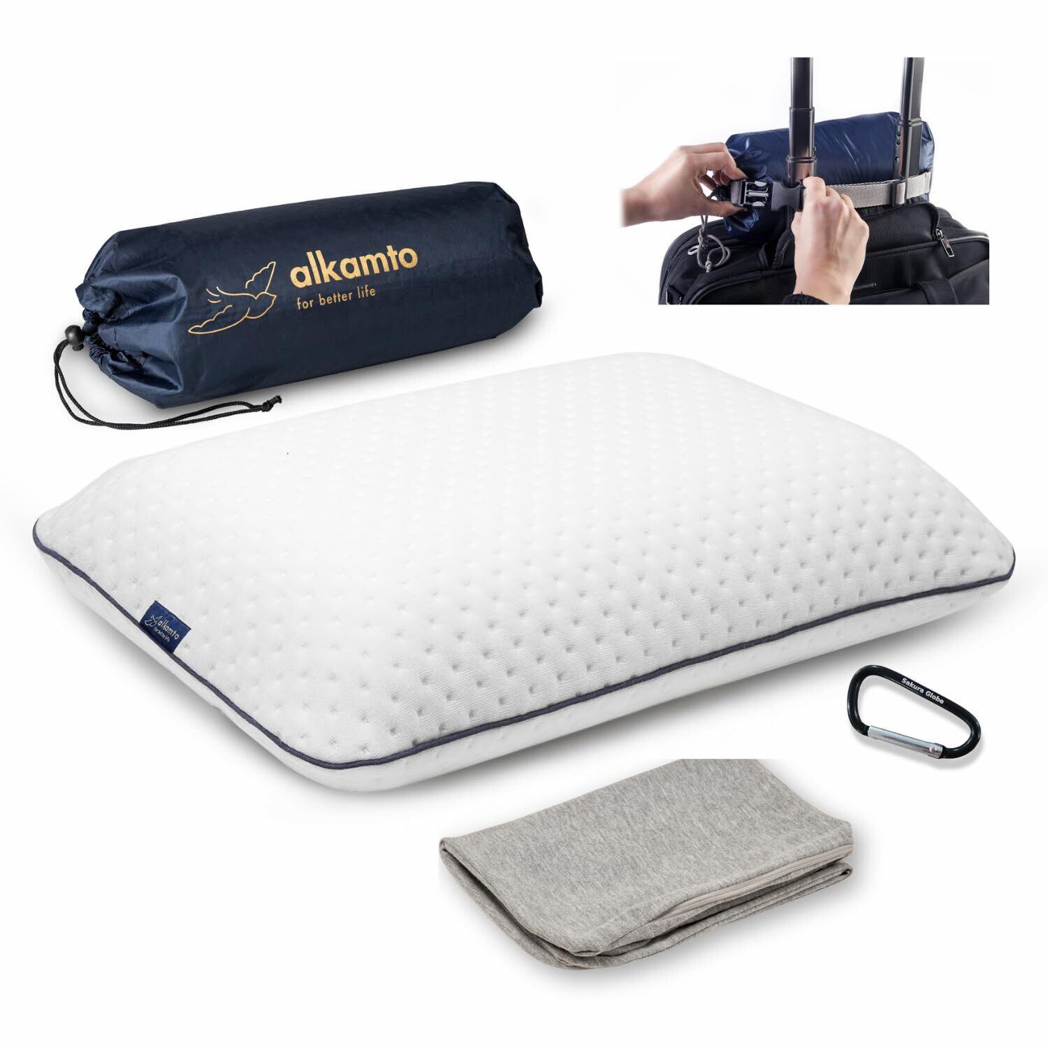 alkamto トラベルピロー 低反発 メモリーフォーム キャンプ枕|旅行用 携帯枕 車中泊 飛行機 新幹線 テント泊用 洗えるカバー付き コンパクト収納|カラビナ付き(ホワイト)