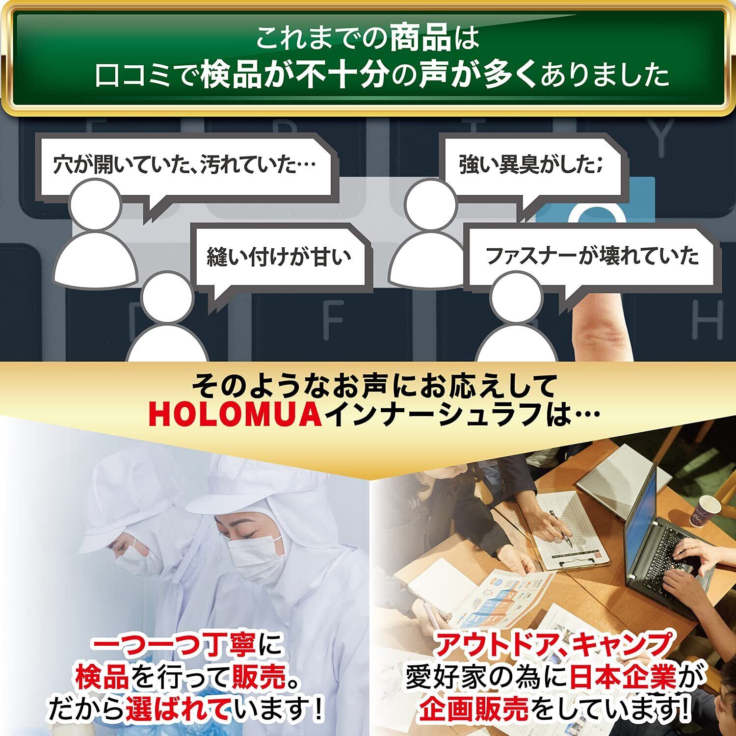 【他社との違いは徹底した検品体制】HOLOMUAの製品は、日本国内で企画販売を行っております。お客様に満足してご利用いただきたいという気持ちから1品1品、丁寧に検品を行っております。中でも「穴が開いてるかの有無」「汚れや傷の有無」「強い異臭の有無」「ファスナーの開閉」「縫い付けが甘いの有無」「ほつれ有無」「糸きり等の作業」については徹底した検品強化をしております。