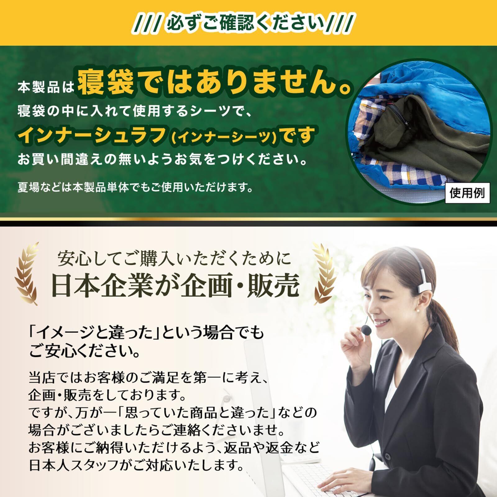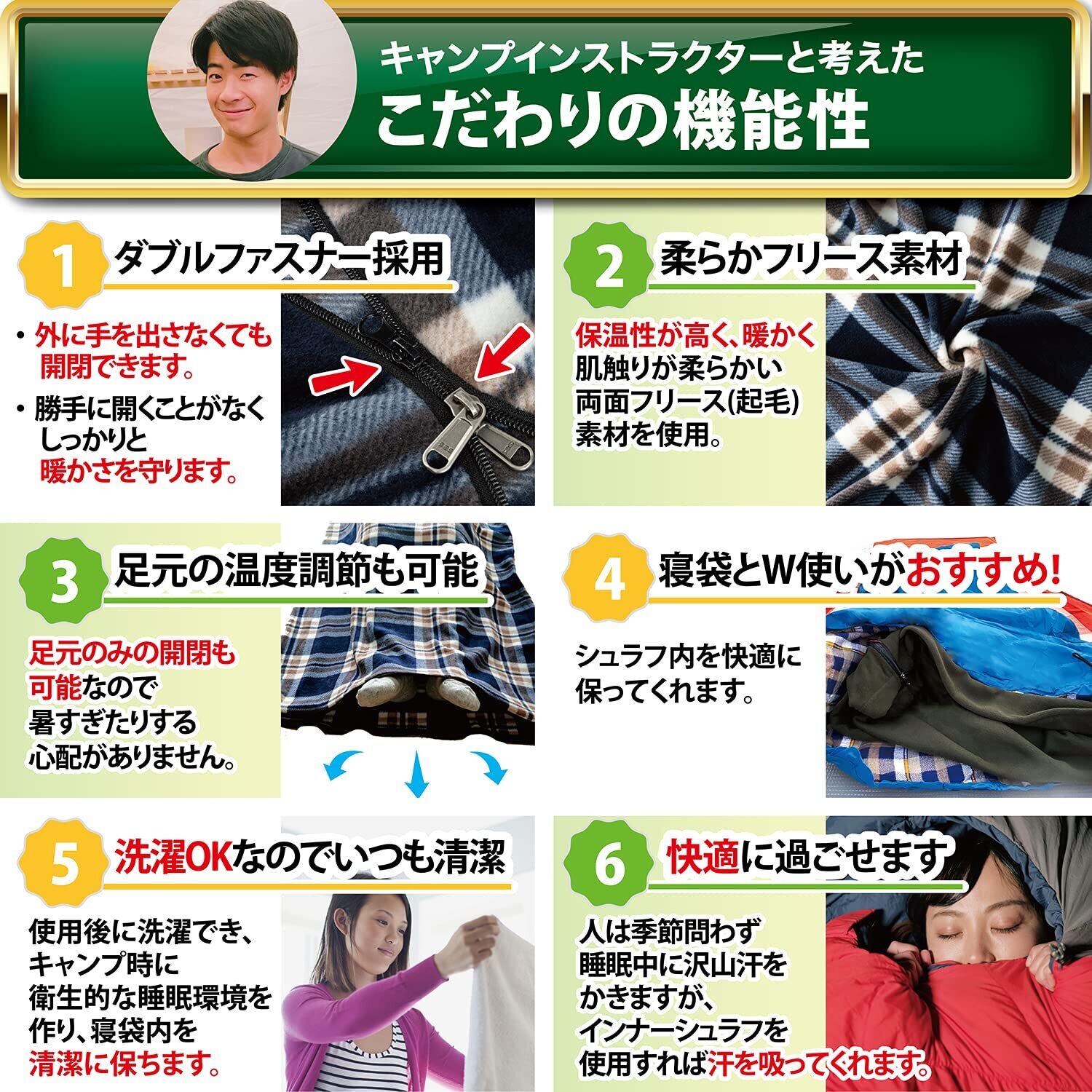 【公益社団法人日本キャンプ協会のキャンプインストラクター監修】当社のインナーシュラフは日本のアウトドアやキャンプをする方に向けた商品開発を行っています。上質な両面フリース素材を採用することで保温性が向上します。キャンプ指導者の監修の元に「このインナーシュラフとシュラフ( 寝袋 )を重ねるだけで快適性を格段に向上してくれる」をモットーに商品製作を行っています。