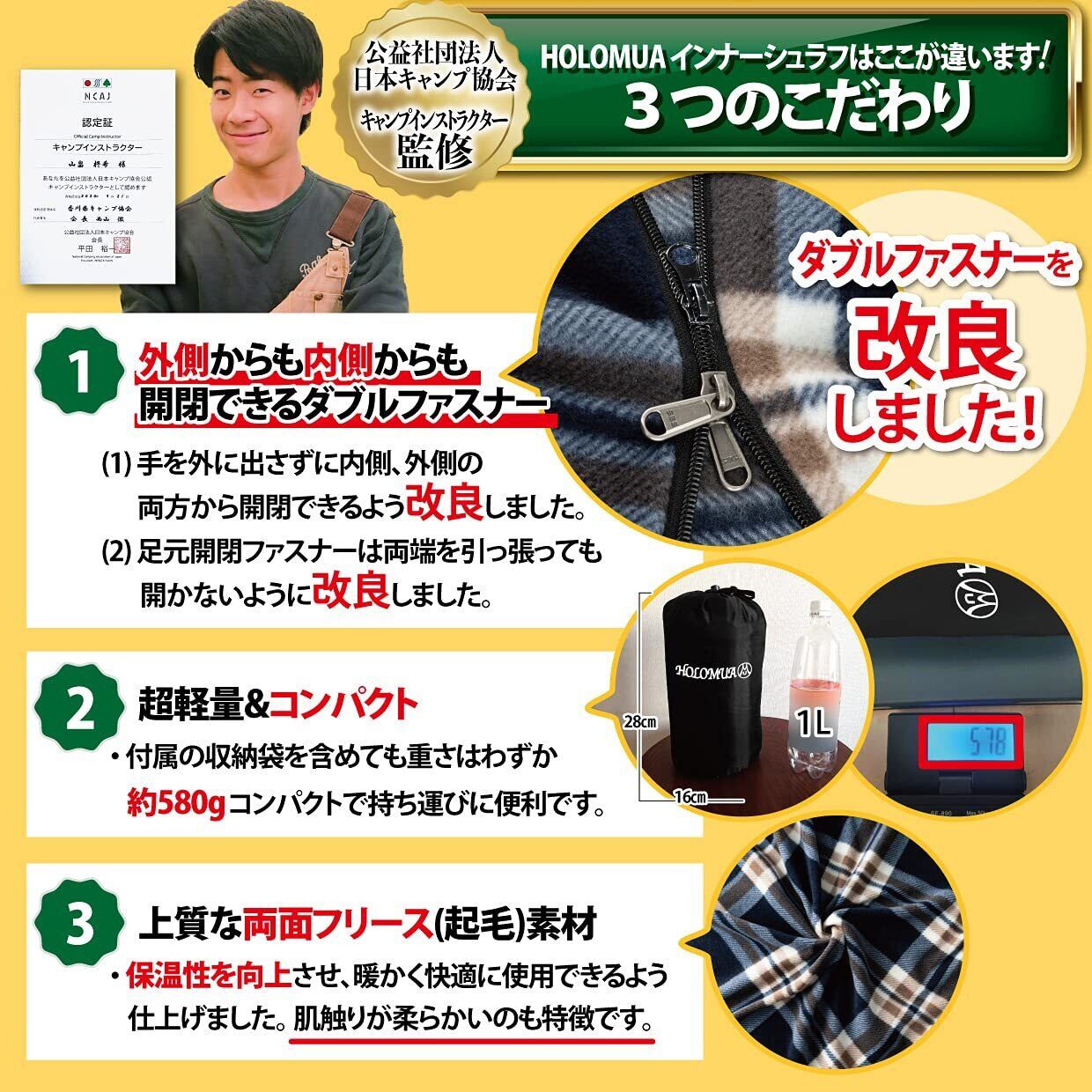 【公益社団法人日本キャンプ協会のキャンプインストラクター監修】当社のインナーシュラフは日本のアウトドアやキャンプをする方に向けた商品開発を行っています。もしもの災害(防災 地震)時にも使用可能です。また、洗濯機で丸洗い可能なので清潔に使用できます。【こだわり】10社以上の工場からサンプルを取り寄せ、細かな改良(ダブルファスナー)に対応して頂けた1社でのみ製造を委託✿ダブルファスナー仕様で側面から足元まで開閉ができるように改良。【日本国内の検査機関で品質試験済み】HOLOMUAのインナーシュラフは発がん性の有害物質(ホムアルデヒド)が基準値以下であることを確認しております。品質・安全にこだわって日本企業が設計・開発を手掛けました。【他社との違いは徹底した検品体制】HOLOMUAの製品は、日本国内で企画販売を行っております。お客様に満足してご利用いただきたいという気持ちから1品1品、丁寧に検品を行っております。中でも「穴が開いてるかの有無」「汚れや傷の有無」「強い異臭の有無」「ファスナーの開閉」「縫い付けが甘いの有無」「ほつれ有無」「糸きり等の作業」については徹底した検品強化をしております。 【安心の365日間長期】HOLOMUAでは独自の365日間メーカーがついています。万が一、当社のインナーシュラフ( インナーシーツ )をお使いになって製品不良が発生した際はすぐに交換、返金にて対応いたします。「自分が思っていたものと違った…」という方にもご使用していただけます。お客様へご満足いただき問題を解決するよう常に最善を尽くしております。