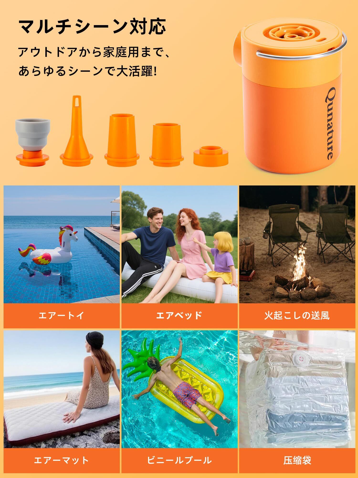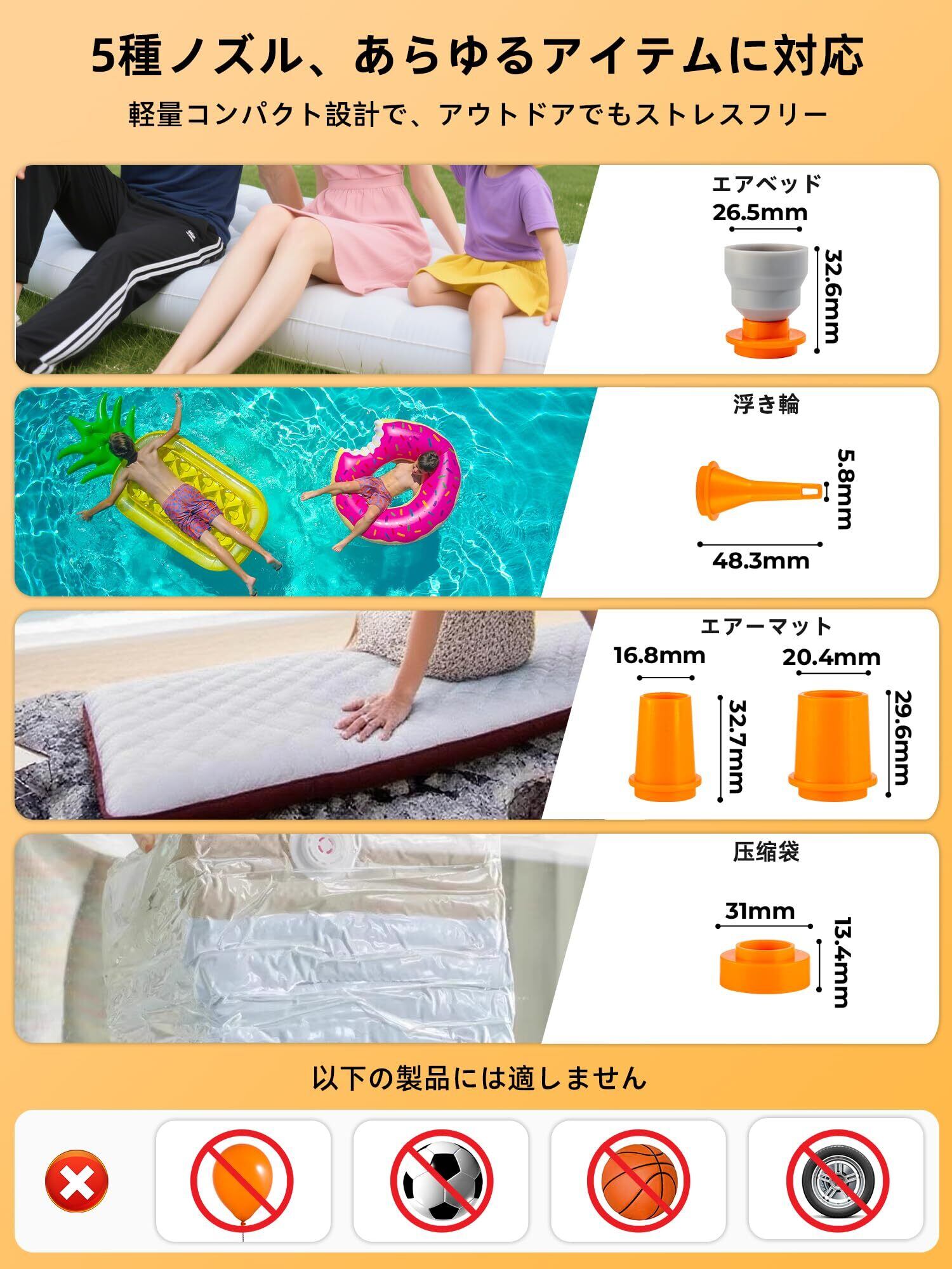 ■【多様なノズルで使い方自由自在!】5種類のノズルが付属しているため、エアマットやエア枕、ゴムボート、浮き輪、圧縮袋など様々なアイテムに対応。アウトドアだけでなく、家庭内でも活躍間違いなしです!