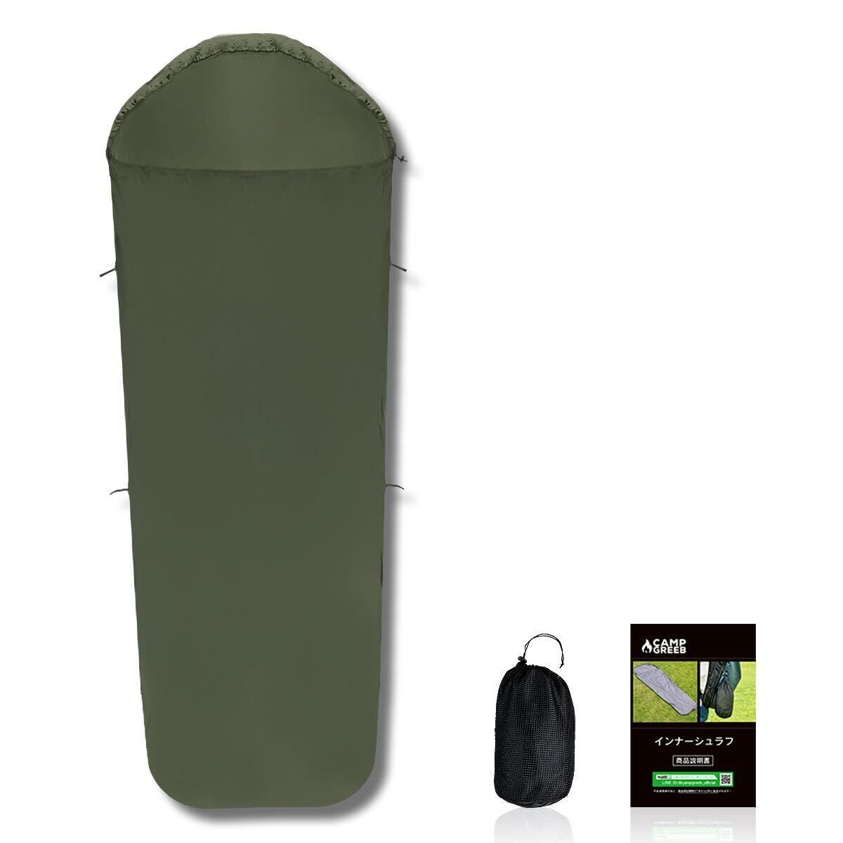 CAMPGREEB 【国内公式ブランド】 インナーシーツ 【足元ゆったり】【フード紐付き】 インナーシュラフ 超軽量 コンパクト 速乾 トラベルシーツ シュラフライナー 保温 肌触り良い 丸洗い可能 アウトドア キャンプ ホテル 山小屋 防災 寝袋内 室内 車中泊 収納袋付き マミー型