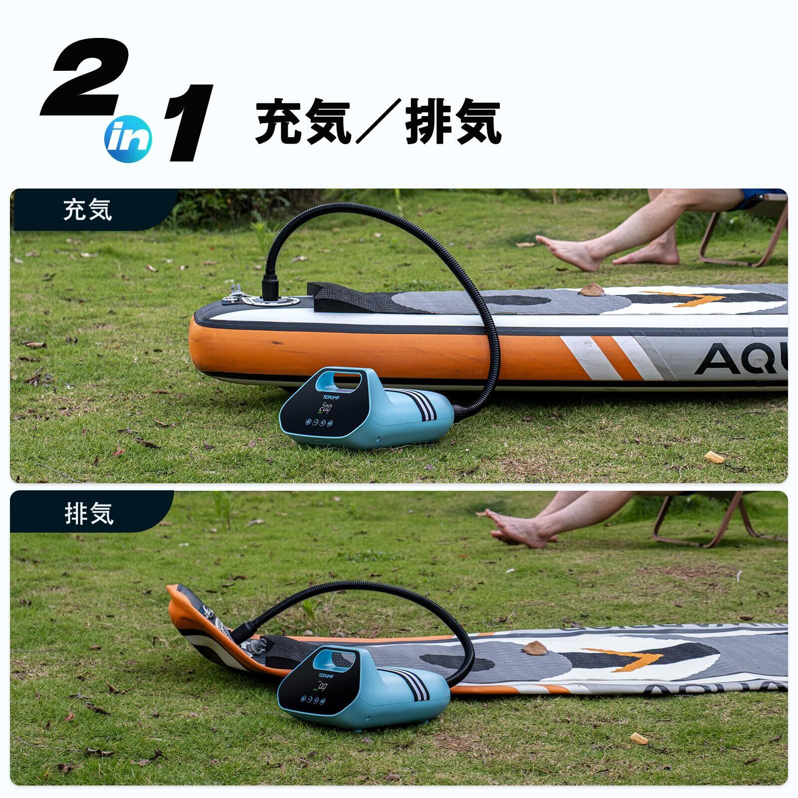 ■【多様なアクセサリーと互換性!】さまざまなインフレータブル製品に対応したノズルが付属していますので、SUPだけでなく、ボートやカヤックにも幅広く使用可能です。これ一台で多彩なシーンでの活躍が期待できます。