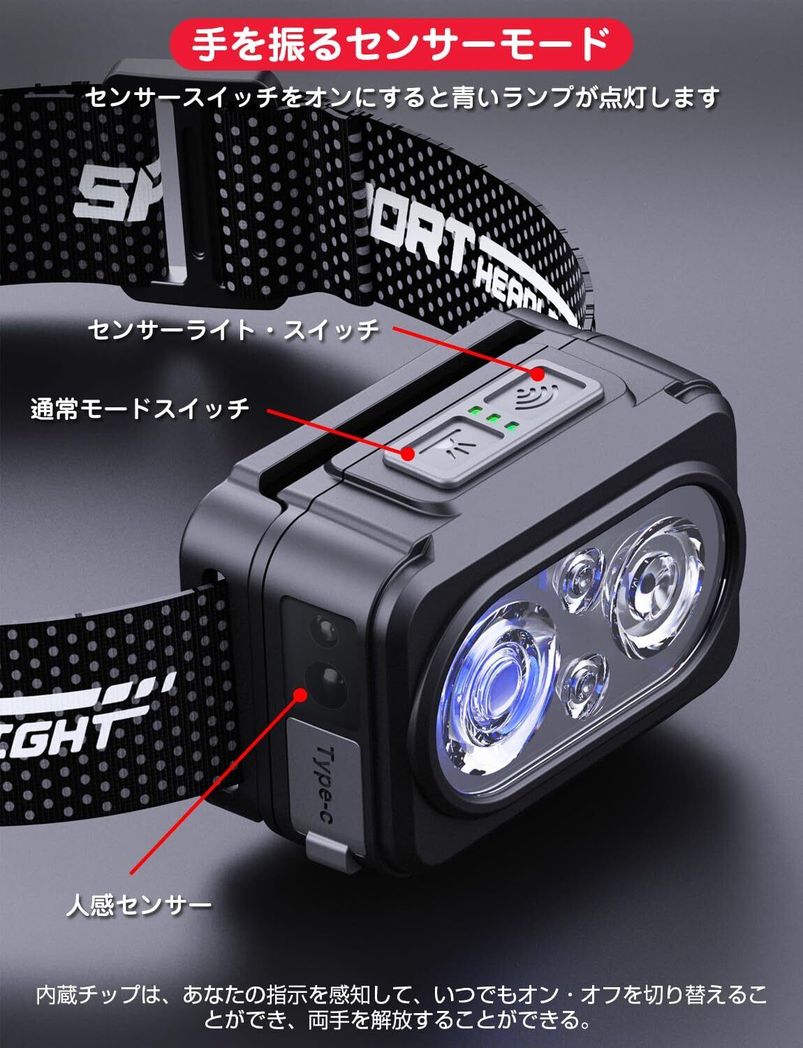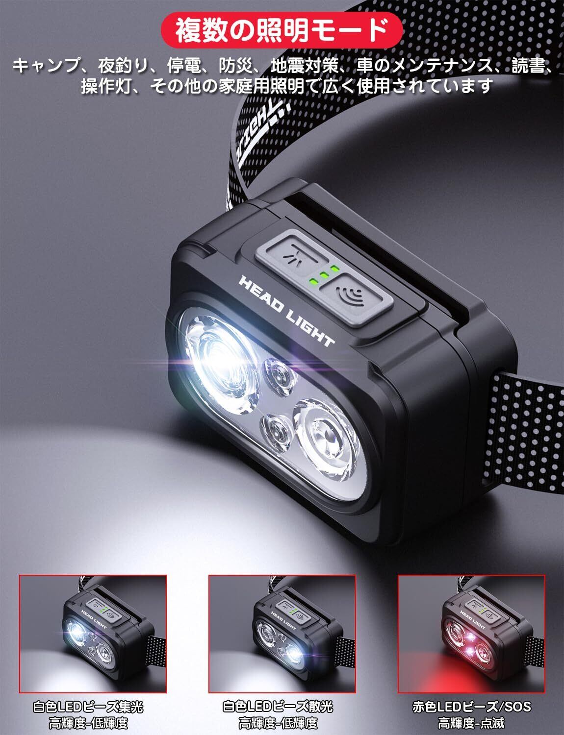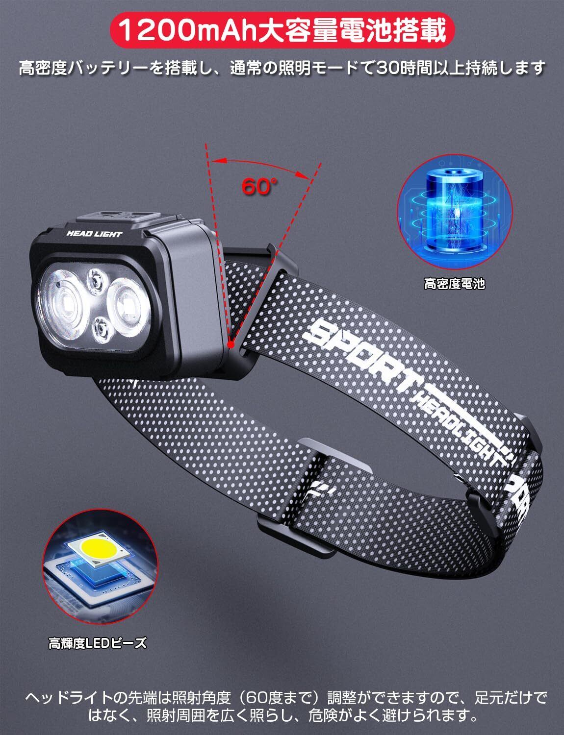 ヘッドライト Type-C充電式 大容量1200mAh 高輝度 LED 600ルーメン 手振りセンサー機能付き 6種点灯モード 赤&白ライト SOS点滅 頭につけ ヘッドランプ 防水防塵 60°角度調整可 夜釣り 最適 登山 キャンプ 散歩 作業 釣り アウトドア 災害 停電用 小型 超軽量 ヘッド ライト