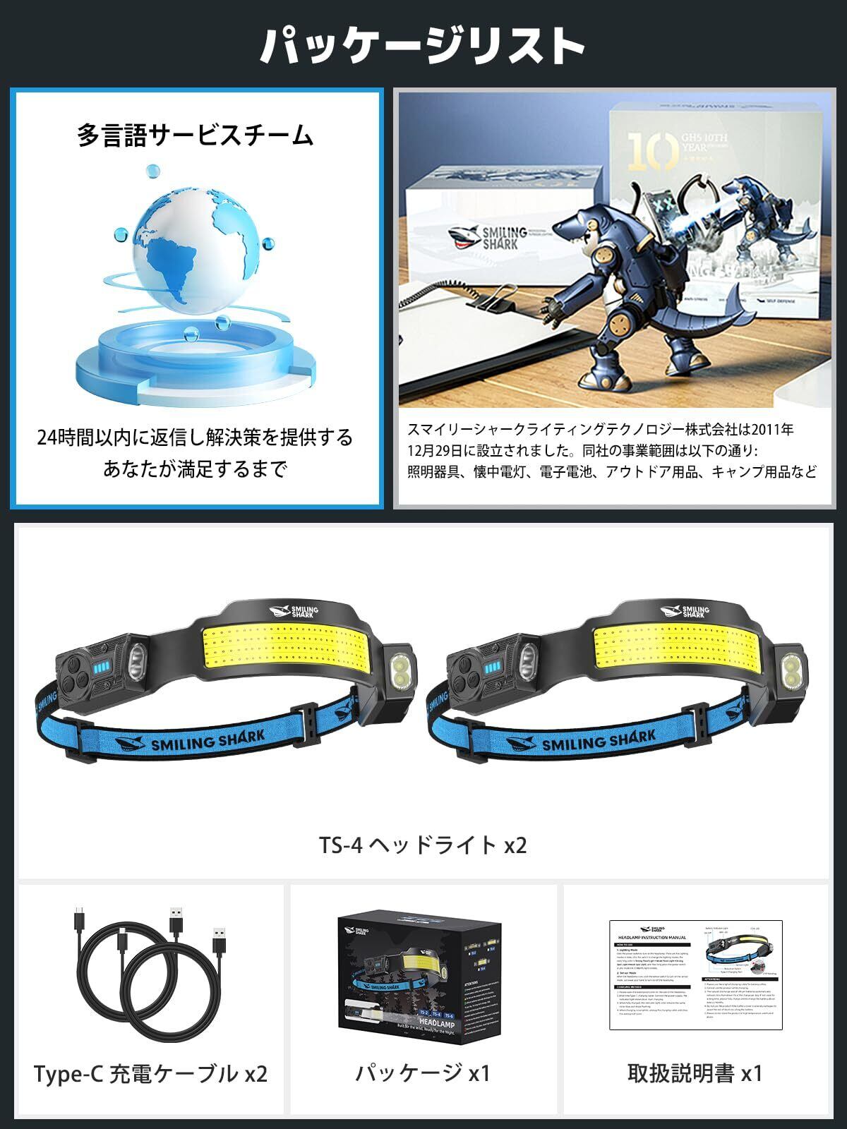 【数量限定】Smiling Shark ヘッドライト TS-4 【新登場・超高輝度COBライト*4・調節な集光ライト】高輝度ヘッドライト Type-C充電式 LEDヘッドランプ 強力 5つ照明モード 点滅 270°広角照明 人感センサー付き 300°角度調整 8時間連続使用可能 IPX4 防水防塵 多機能 釣り/登山/散歩/キャンプ/作業/災害/停電最適 二個入り 日本語取扱説明書