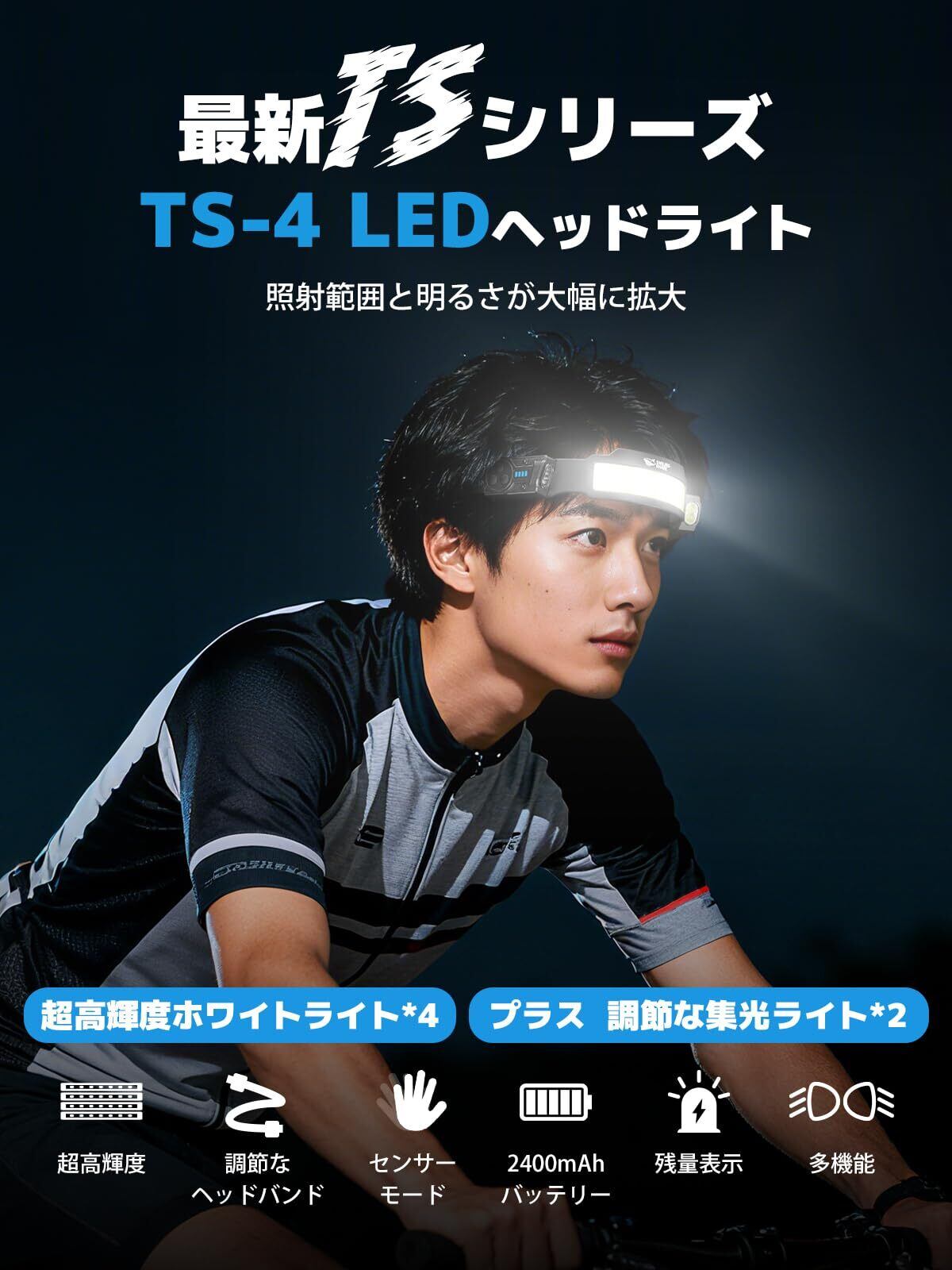 【最新のTSシリーズ・四倍輝度】2025年新登場ヘッドライト―TSシリーズ、より明るい照明とより幅広い範囲!TS-4は2つ調節な集光ライトと4個の高輝度COBライトを備わっており、明るさが大幅に向上させ、暗闇も簡単に照らします。また、上下に調節可能な集光ライトによって、全方位の照明を提供します。最新モデルとして、仕事やアウトドア活動に高輝度で強力の照明を提供しています。