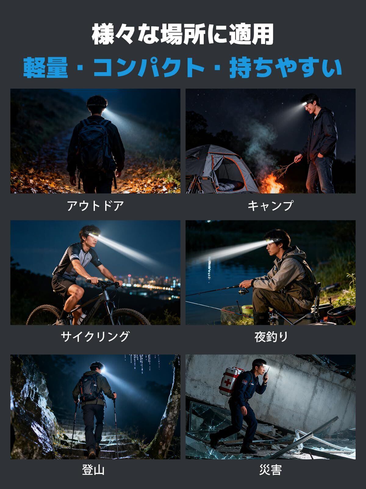 【悪天候でも安心・夜間の活動に最適】このヘッドランプは、耐久性のある防水ハウジングで設計されており、雨や水に濡れた環境(洞窟や雨の日など)での使用に適しています。キャンプ、ハイキング、釣り、DIYなど、このヘッドランプはあらゆる夜間活動に最適な光を提供します。
