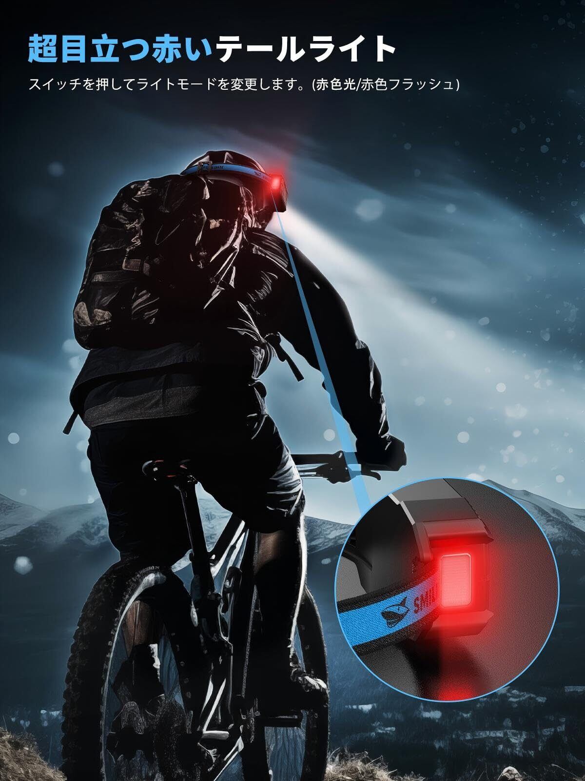 【赤色灯テールライト】赤いリアライトはとても人目を引きます。クリックすると高輝度/フラッシュモードに切り替わり、夜間走行時の事故を避けるために、赤いライトで後ろから発見されるのを助けます。