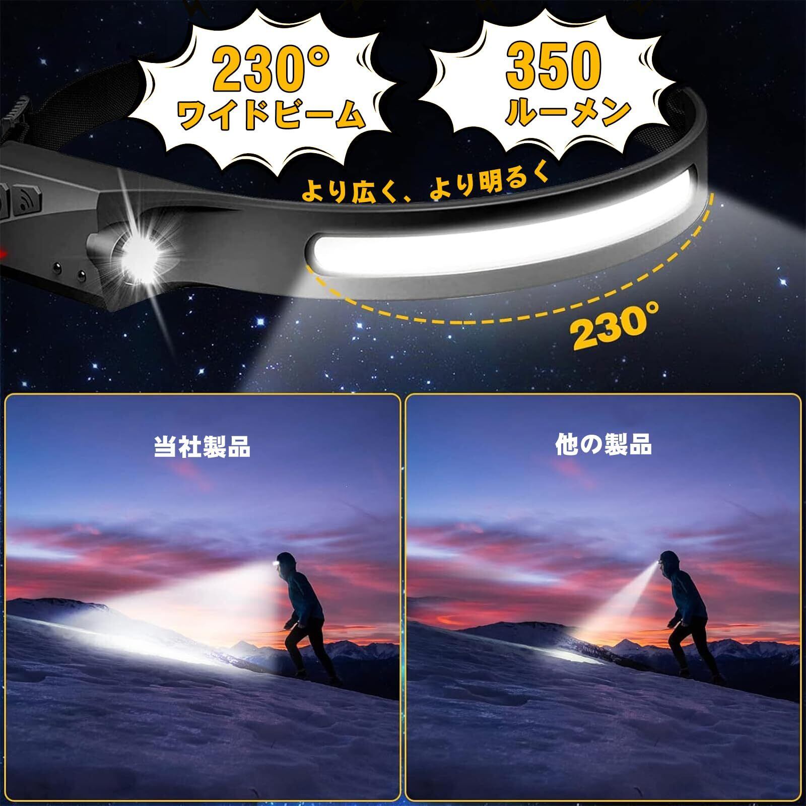 【赤い白色光のアップグレード & 高輝度50㎡超大面積照射】:業界初の赤白警告ヘッドライト。ヘッドライトのライトをアップグレードしました。 白色光の明るさを増すだけでなく、警告する赤い光も追加します、安全性が向上しています。 この充電式 ヘッドランプには5つの照明モード(COB / XPE)があり、フラッドモードとスポットライトモードを自由に切り替えることができます。 照射範囲は最大230°で45m照射距離(350ルーメン)。 この ヘッドライト 充電式 USB さまざまな環境で使用できます。