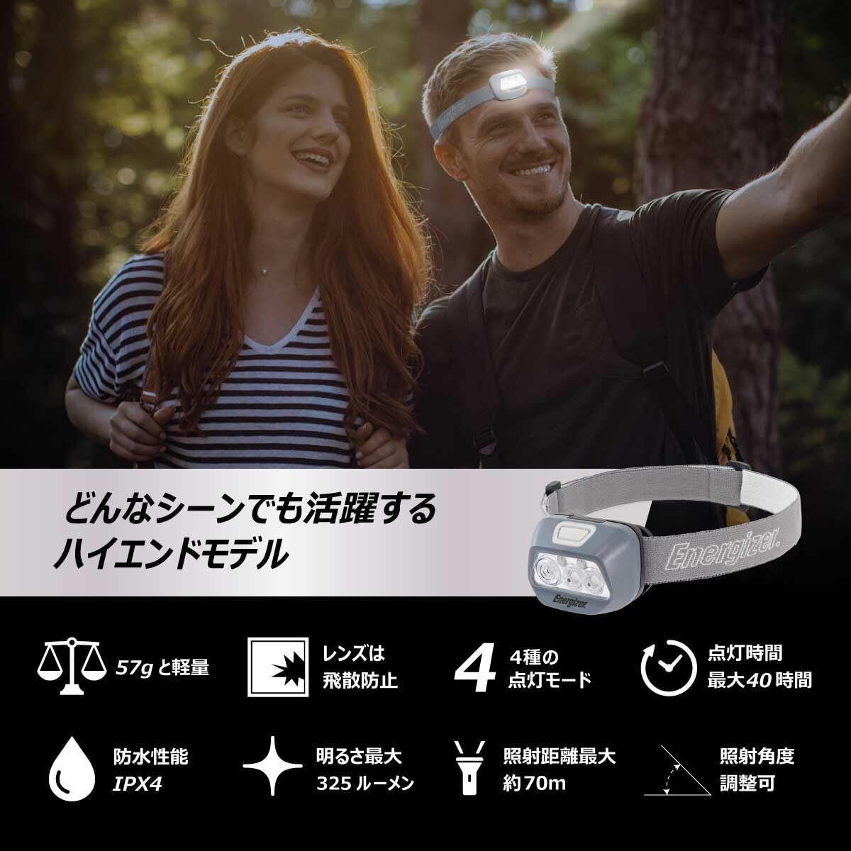 【数量限定】エナジャイザー ヘッドライト LED 単4電池 明るさ最大325ルーメン 照射最大距離70m 点灯時間最大40時間 4種点灯モード 防水防塵 飛散防止レンジ 角度調整 IPX4対応 釣り 登山 キャンプ 散歩 作業 アウトドア 災害 停電用 HDL20 T12A32