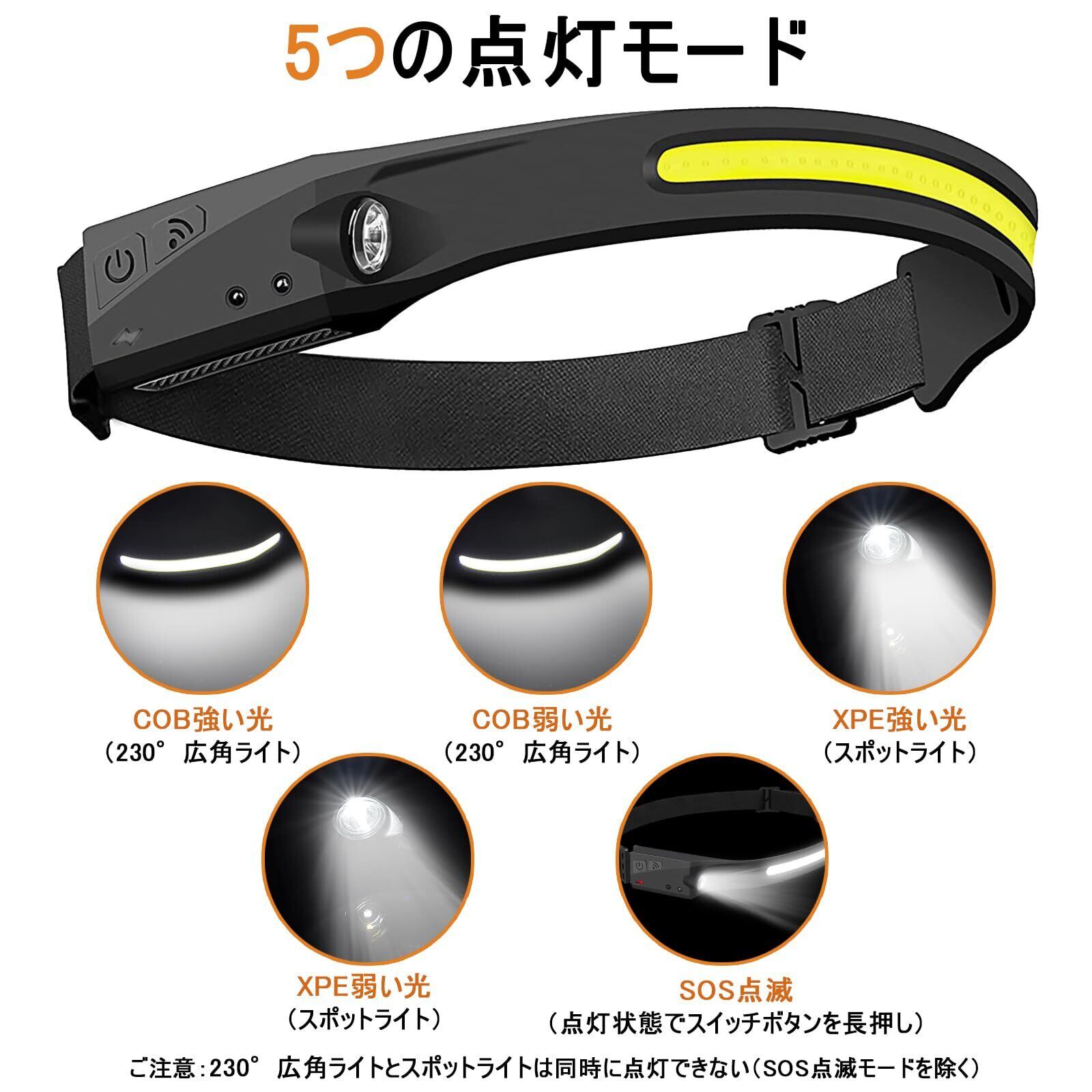 【高輝度・5つの点灯モード】ヘッドライトは高品質ライトを搭載し、光学凸レンズを採用し、デュアル光源、230°広角ライトとスポットライト、最大明るさ約350ルーメン。電源ボタンを押して照明モードを切り替え、多用途を実現します。COB強い光モード、COB弱い光モード、XPE強い光モード、XPE弱い光モード、SOS点滅モード。