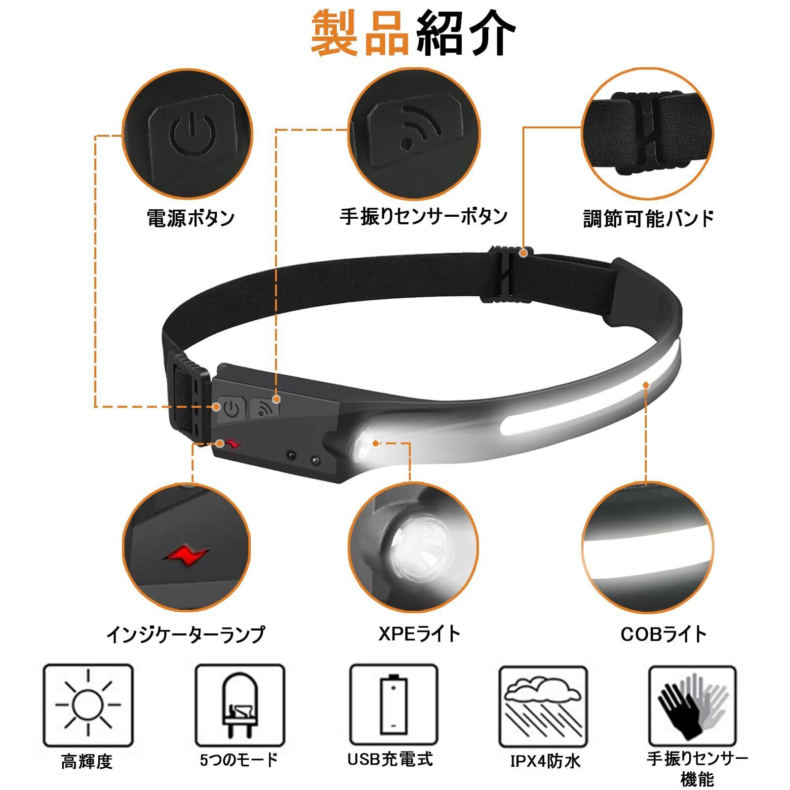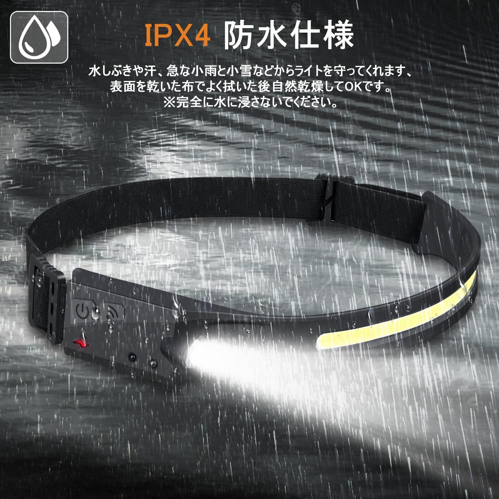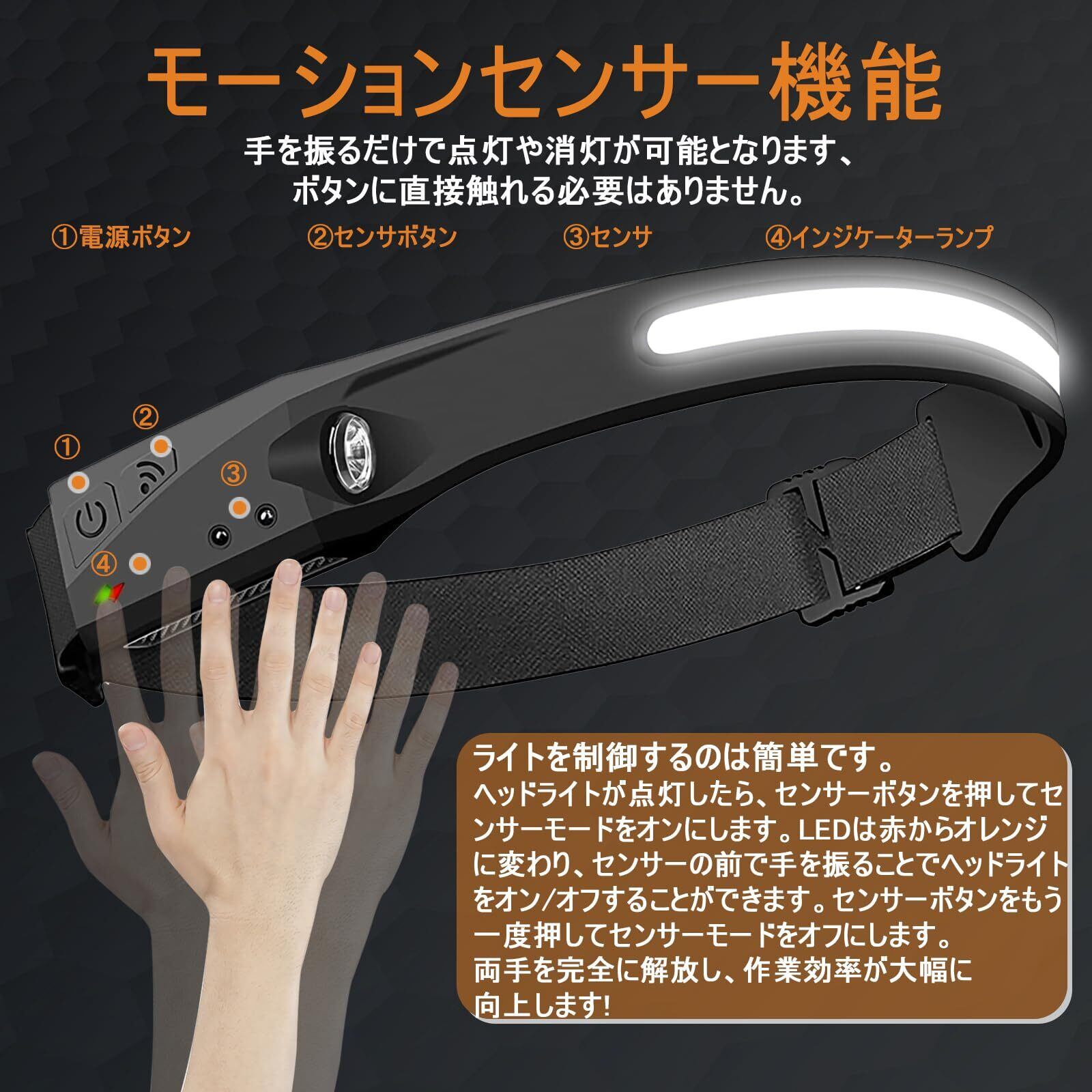 【230°広角照明・手振りセンサー機能搭載】ヘッドライトは、230°の広角ライトと側面長距離照明のスポットライトを含む。広域照明は、頭の回転を減らすことができますが、照明効果がよい。手振りセンサー機能を搭載しているので、ヘッドライトが点灯したら、センサーボタンを押してセンサーモードをオンにします、手を振るだけで点灯や消灯が可能となります。手が汚い場合は、触れなくても電気を消すことができます。