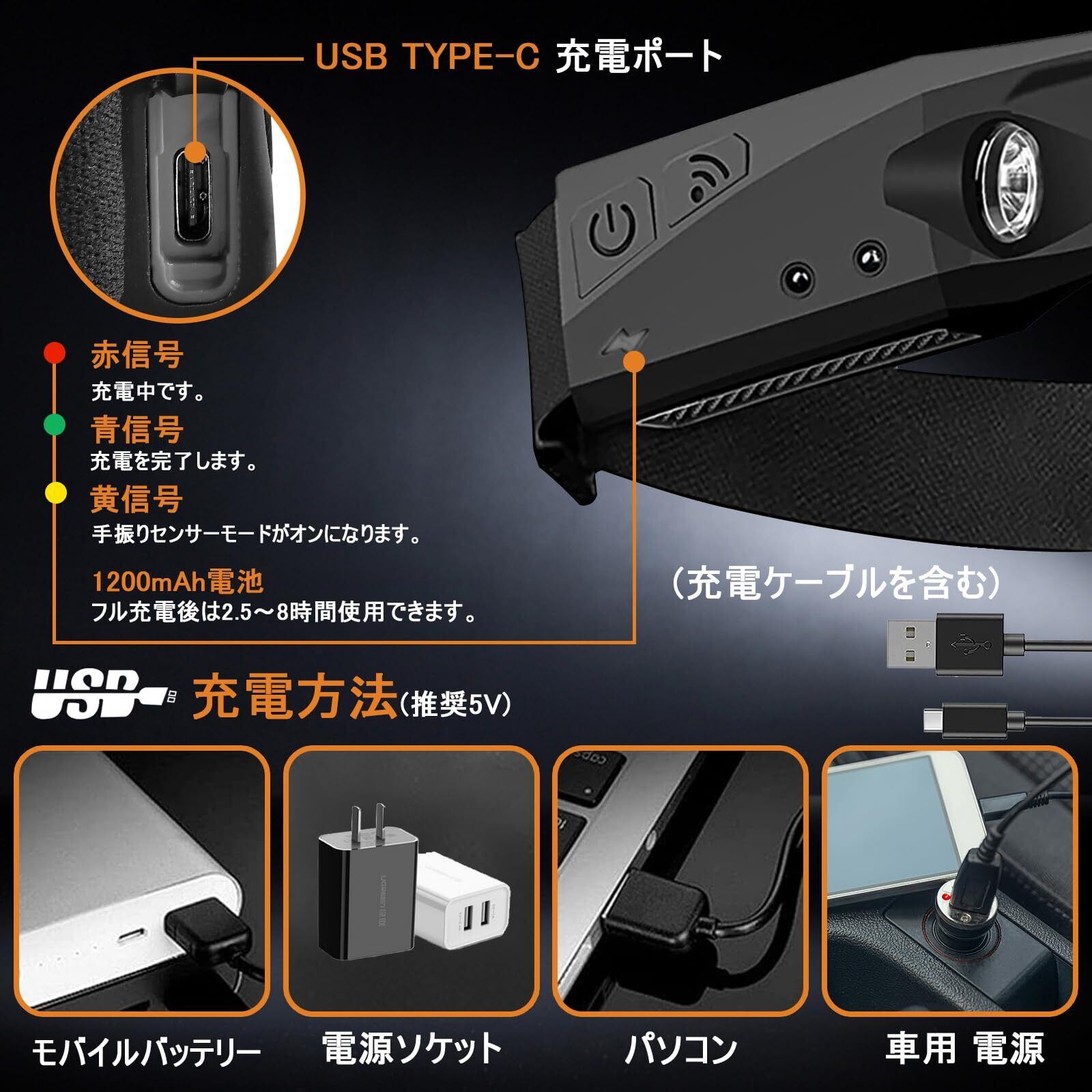 ヘッドライト 充電式 高輝度 LED ヘッドランプ 【デュアル光源/230°広角照明/5つの点灯モード/手振りセンサー機能付き】 IPX4防水 防塵 小型軽量 へっどらいと 1200mAh電池 USB TYPE-C 充電式 最大8時間使用可能 最大明るさ350ルーメン SOS点滅 散歩 夜釣り キャンプ ヘルメットライト 停電 非常時 日本語取扱説明書付き (ブラック, 1)
