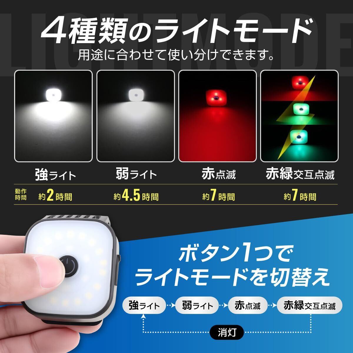■【明るさ調整機能!】複数の明るさモードを搭載しており、シーンに応じて簡単に明るさを調整可能。夜間の散歩や運動時に、安心して周囲を照らし出し、より安全にアクティビティを楽しむことができます。