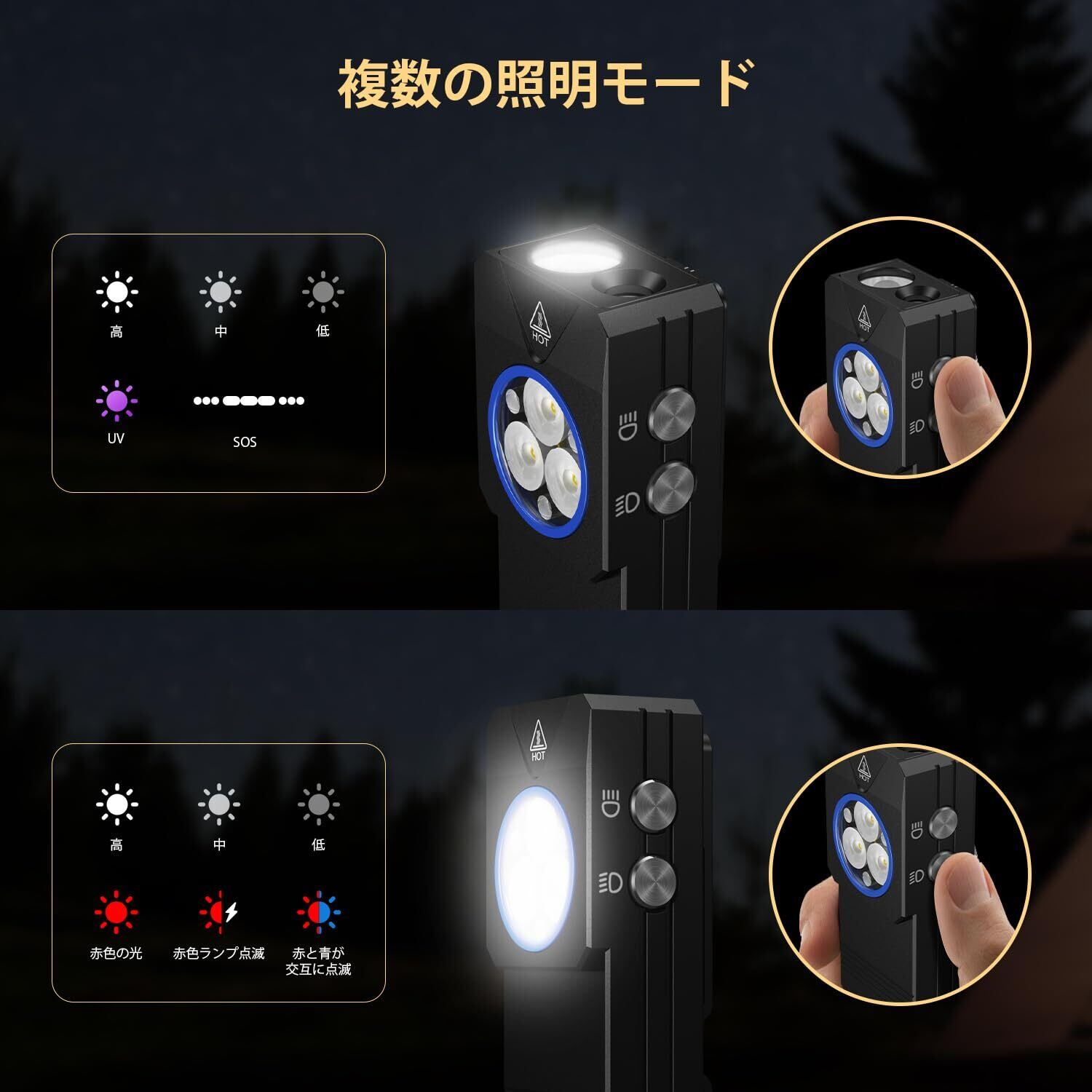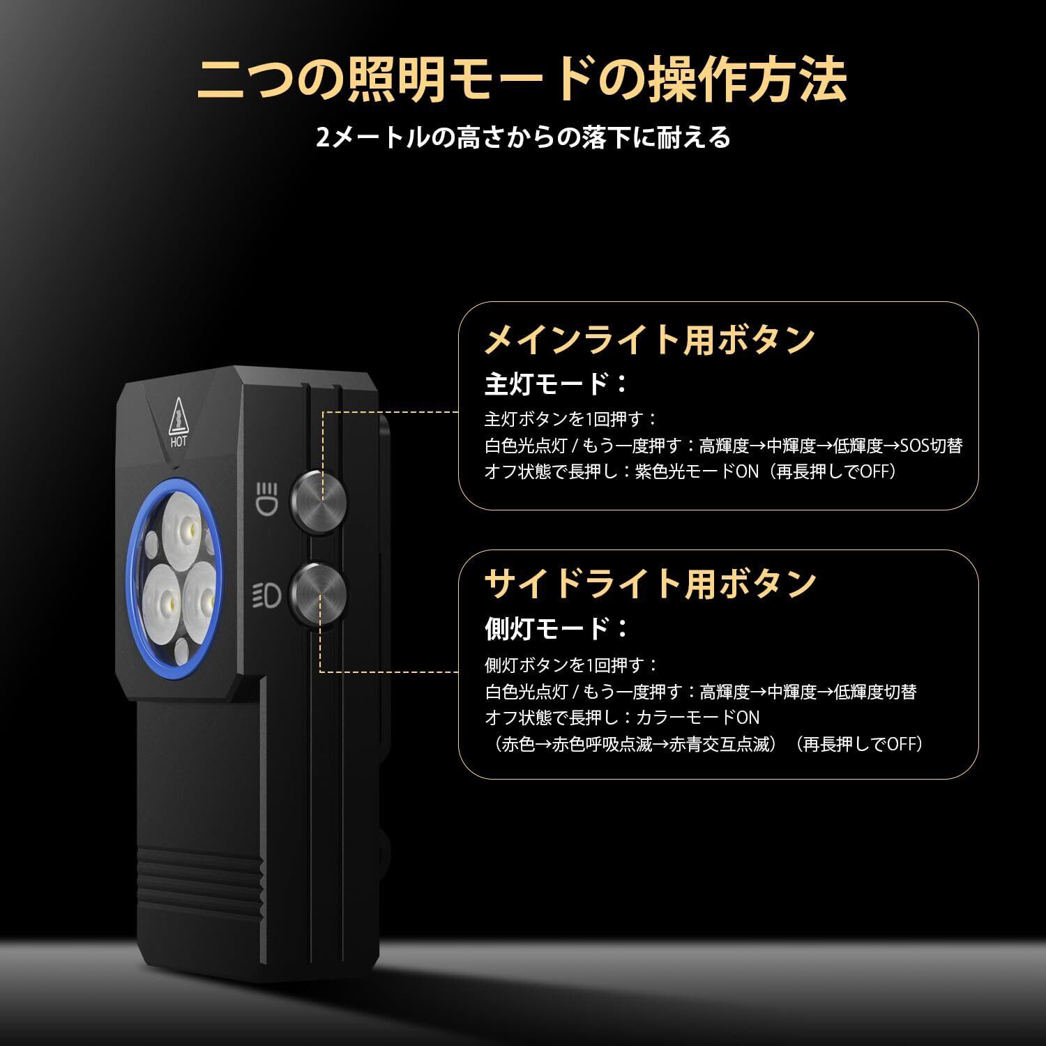 【多機能携帯型LEDライト】このライトは、携帯性に優れた両側LED光源デザインで、トップライトとサイドライトはそれぞれ独立したスイッチで操作できます。コンパクトで耐久性があり、装着も簡単です。最大輝度は550ルーメンで、最大50mの明るくクリアな照明を提供します。懐中電灯は合計11種類の照明モードを搭載しており、トップライトにはホワイトライト、紫外線、SOSモードがあり、サイドライトにはホワイトライト、赤色ライト、赤色点滅、赤/青色点滅モードがあります。日常の携帯用途や、緊急停電・防災などの特殊な状況にも幅広く対応できるほか、紙幣検査ライトや秋冬シーズンのランニングライトとしても活躍します。