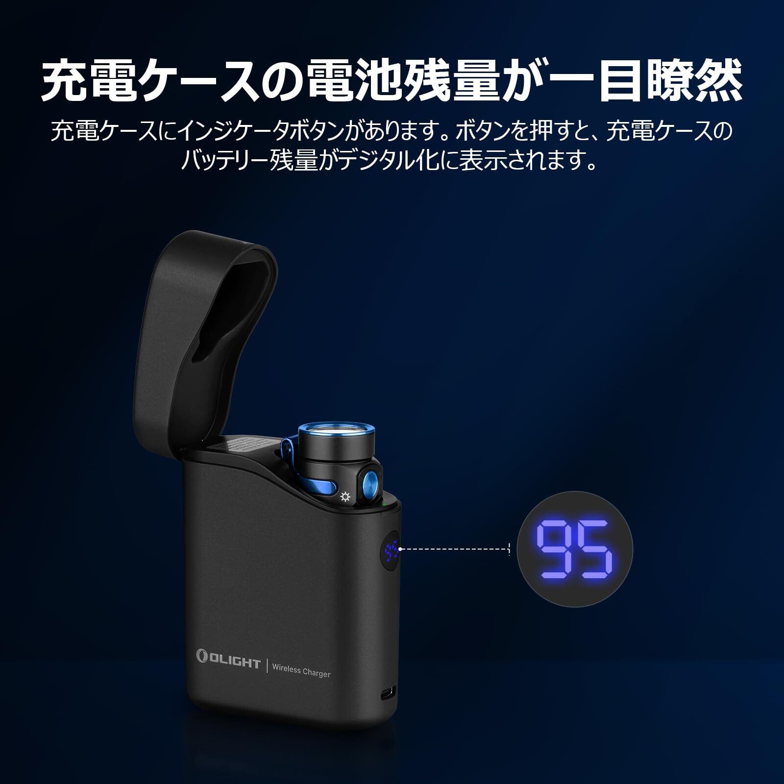 {多シリーズ対応に充電} お客様の利便性のため、Baton 4 Kitは双方向TypeCでワイヤレス充電ケースに接続し、他の電子機器を充電する機能が追加されます。対応するOLIGHT懐中電灯の充電だけでなく、Type-C充電に対応する他の携帯電話などの電子機器の緊急充電にも使用でき、幅広い用途に使用できます。また、充電ケースには電量表示がデジタル化され、電量残量を簡潔に表示しています。OLIGHTのBaton 3、S1RII、Perun mini、Perun 2 miniというシリーズの懐中電灯とヘッドライトにも適用しています。充電ケースには、懐中電灯の充電状態を示す赤と緑のインジケータライトが組み込まれています(蓋が閉まっていない場合でも、充電しながら懐中電灯が点灯できます)