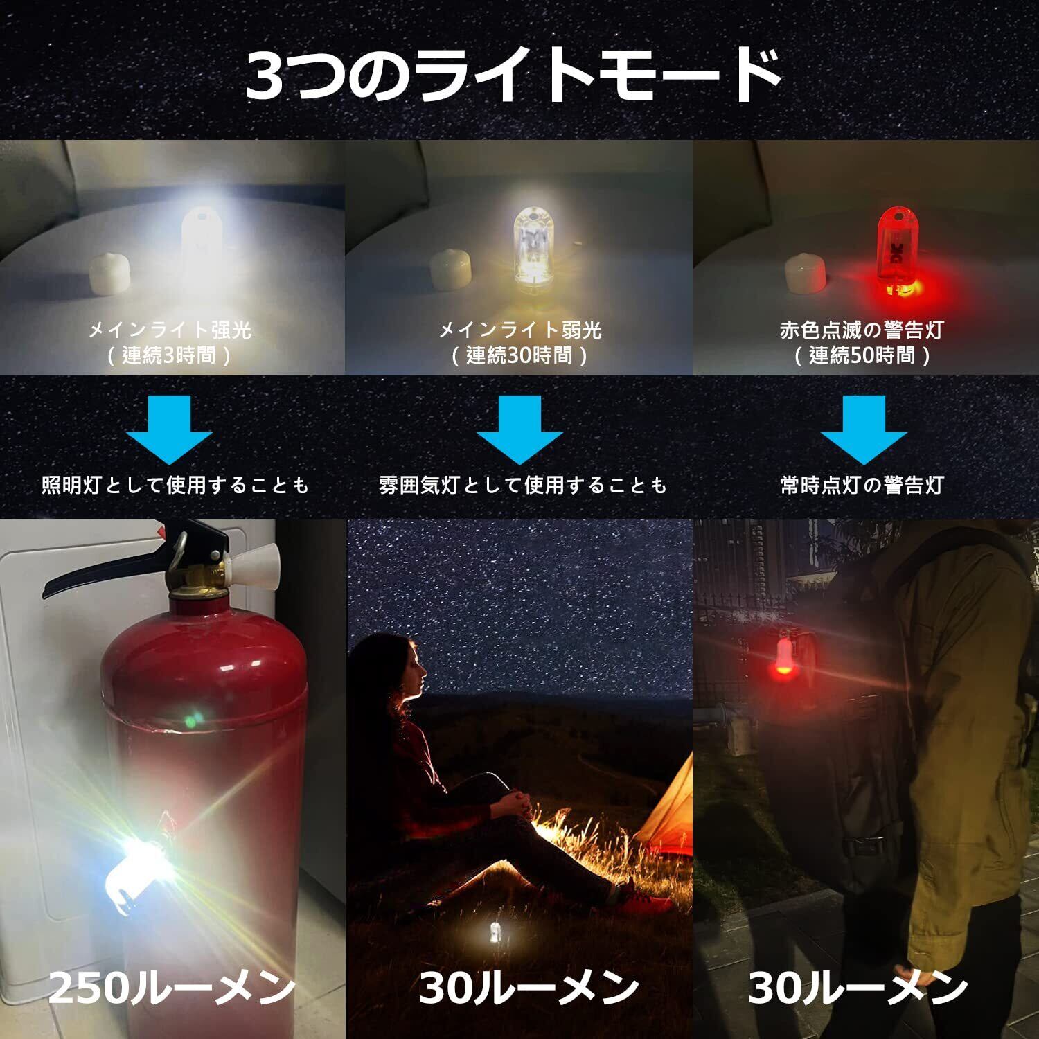 【多彩な機能と用途】①3つのライトモード:赤色の点滅警告灯(30ルーメン/連続50時間)、弱光(30ルーメン/連続30時間)、強光(250ルーメン/連続3時間)。②様々な固定方法が備わっており、フラットな底面で直接使用できるほか、磁気吸着機能により、任意の鉄製の平面に簡単に吸着させることができます。また、キーホルダーやバッグに吊るすこともできるため、非常に持ち運びに適したEDCライトです。③小型 懐中電灯、キャンプ led ミニ ランタン、ポケットライト、投光器、ナイトライト、警告灯、夜間ランニングライト、読書灯、雰囲気照明、ペット用ライトなどに使用でき、非常に実用的です。