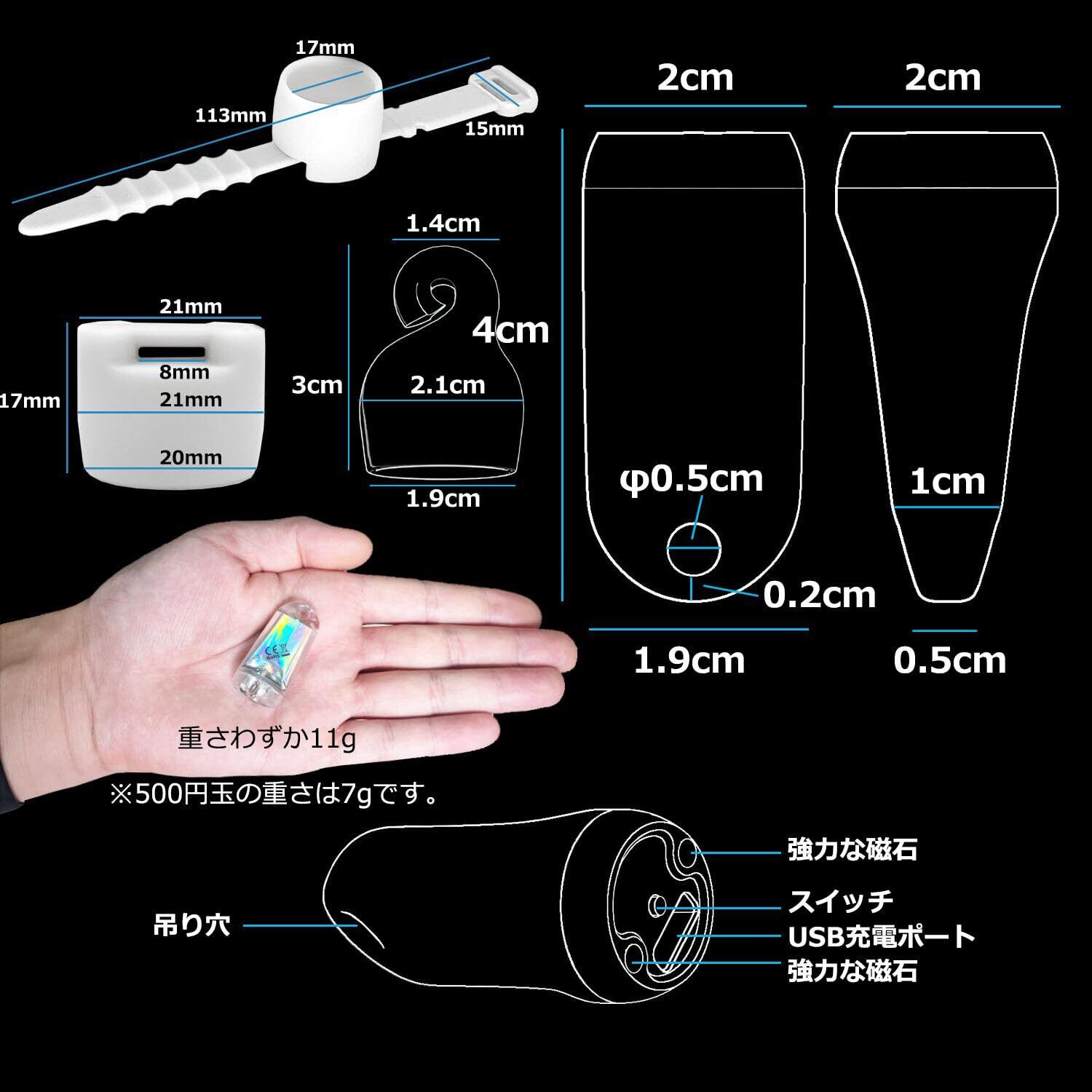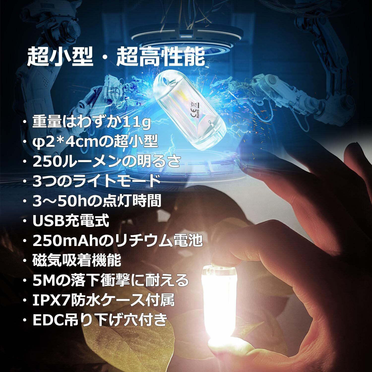 【極小なサイズと超強力な性能】①TYPE-C(USB-C)充電ポートが新しくなり、より実用的で便利になりました。②超小型のサイズで、φ2×4cmの大きさで、わずか11gの重量であり、Apple AirTagと同じ重量です。③高輝度LEDチップを採用し、最大で250ルーメンまで発光します。④充電式 250mAhのリチウムポリマー電池を内蔵し、最大50時間の連続稼働が可能です。⑤スマート調整プログラムを内蔵しており、均一な明るさをします。