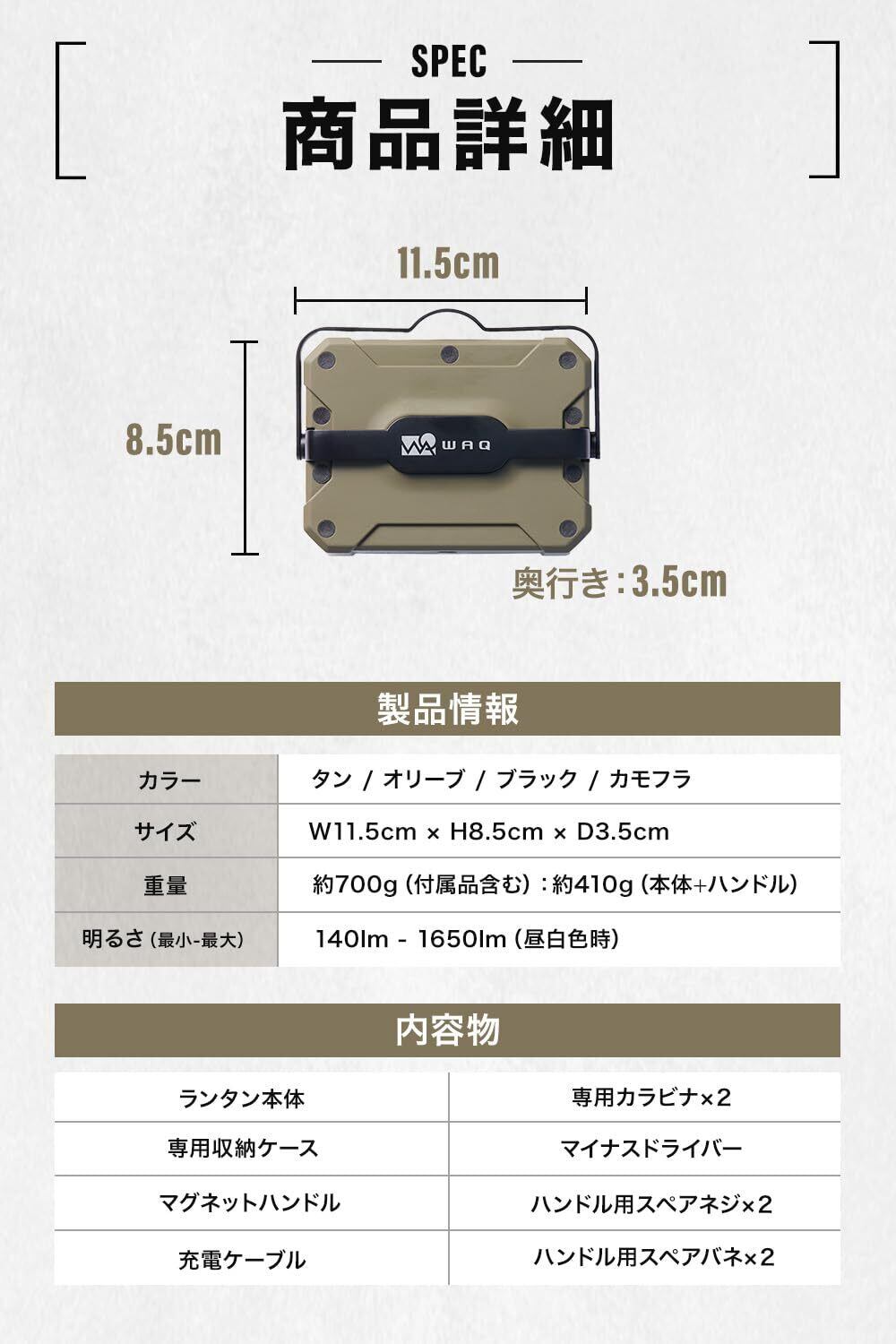 【付属品について】”専用カラビナ”使用することでテント内など、ランタンフックのない場所でも吊るすことができます。※安全のため本製品以外への使用はお控えください。【サイズ/重量】・サイズ本体サイズ:11.5cm x 8cm x 3.5cm・重量(付属品含む)約700g(本体のみ(ハンドル付き):約410g)