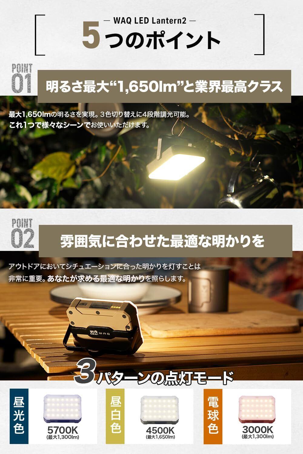 WAQ LEDランタン 2 暖色 電球色 昼光色 USB充電式 (1650ルーメン/13400mah/連続点灯24時間/PSE) 防水 LED LANTERN2 WAQ-LL02