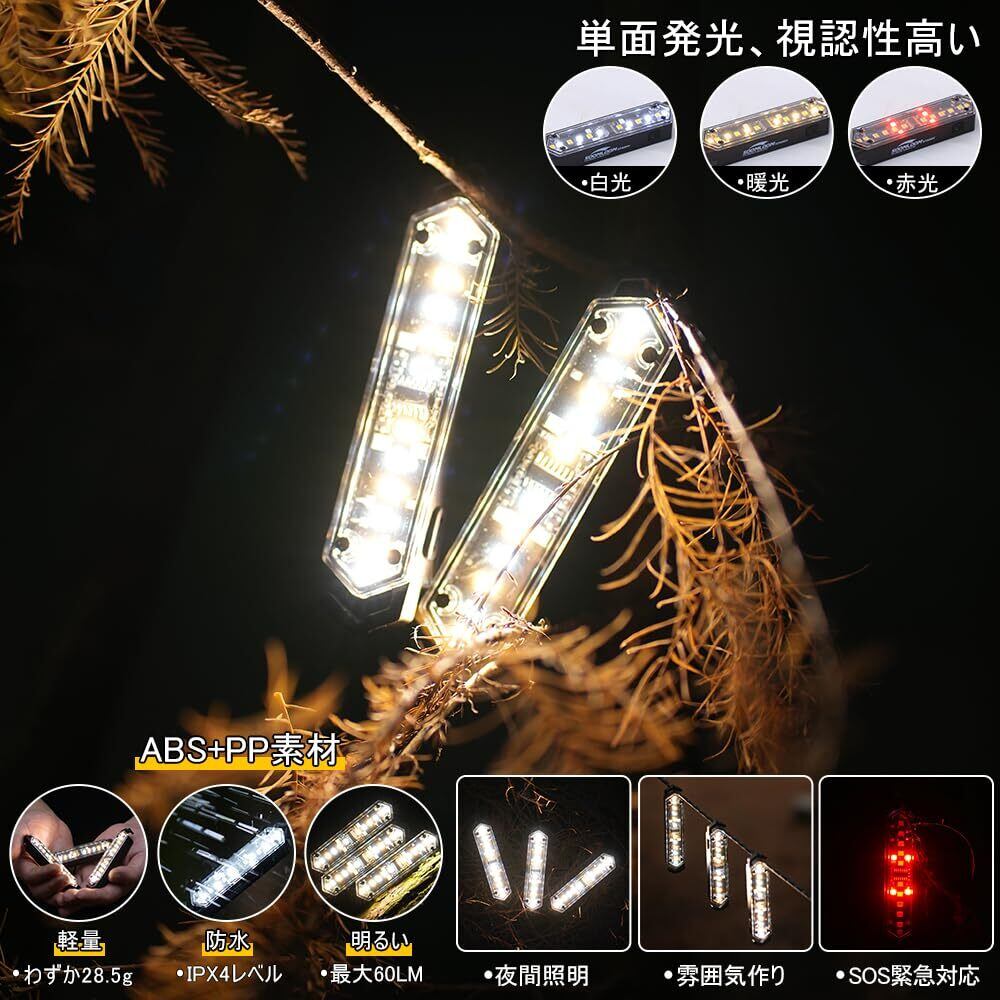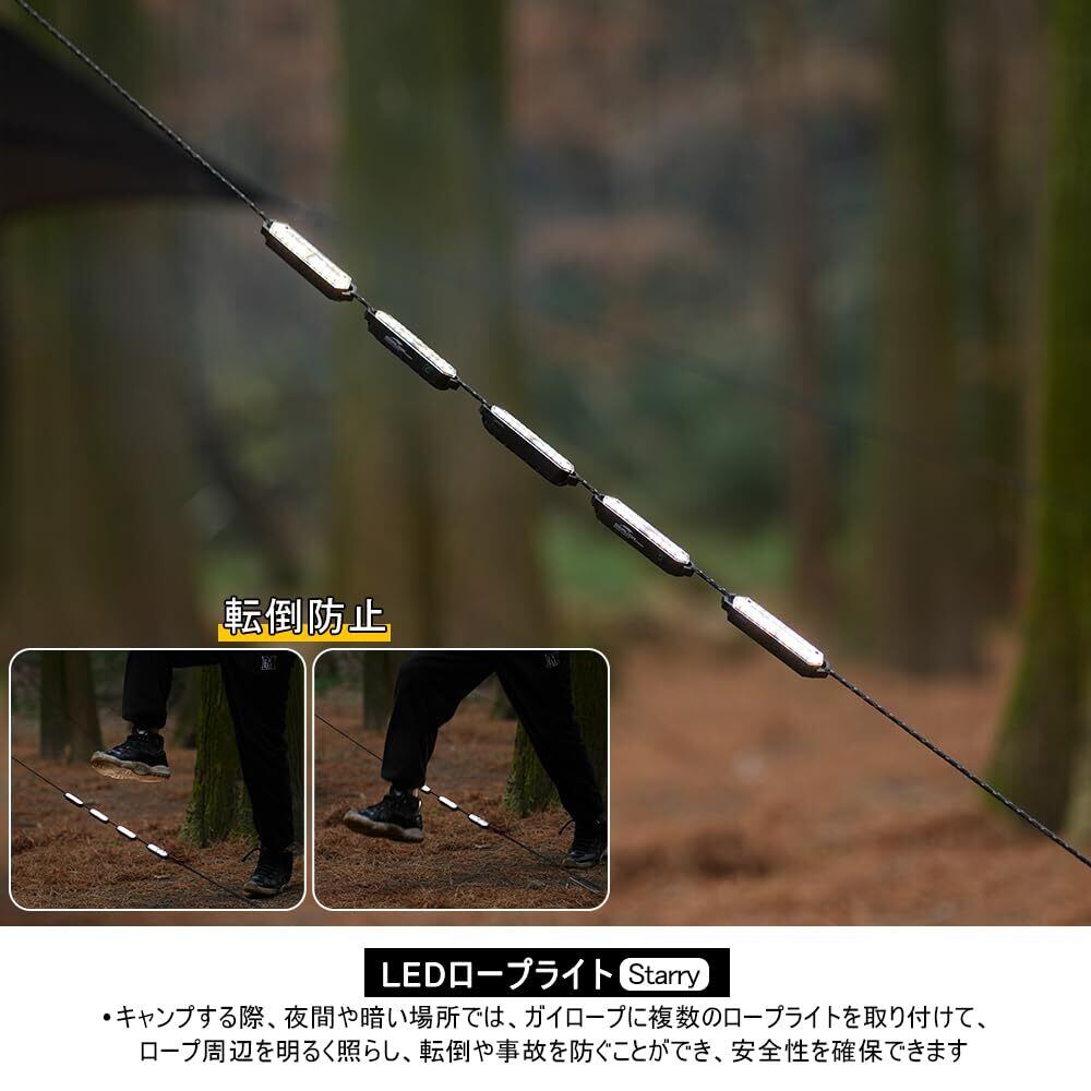 転倒防止:キャンプする際、夜間や暗い場所では、ガイロープに複数のロープライトを取り付けて、ロープ周辺を明るく照らし、転倒や事故を防ぐことができ、安全性を確保できます。
