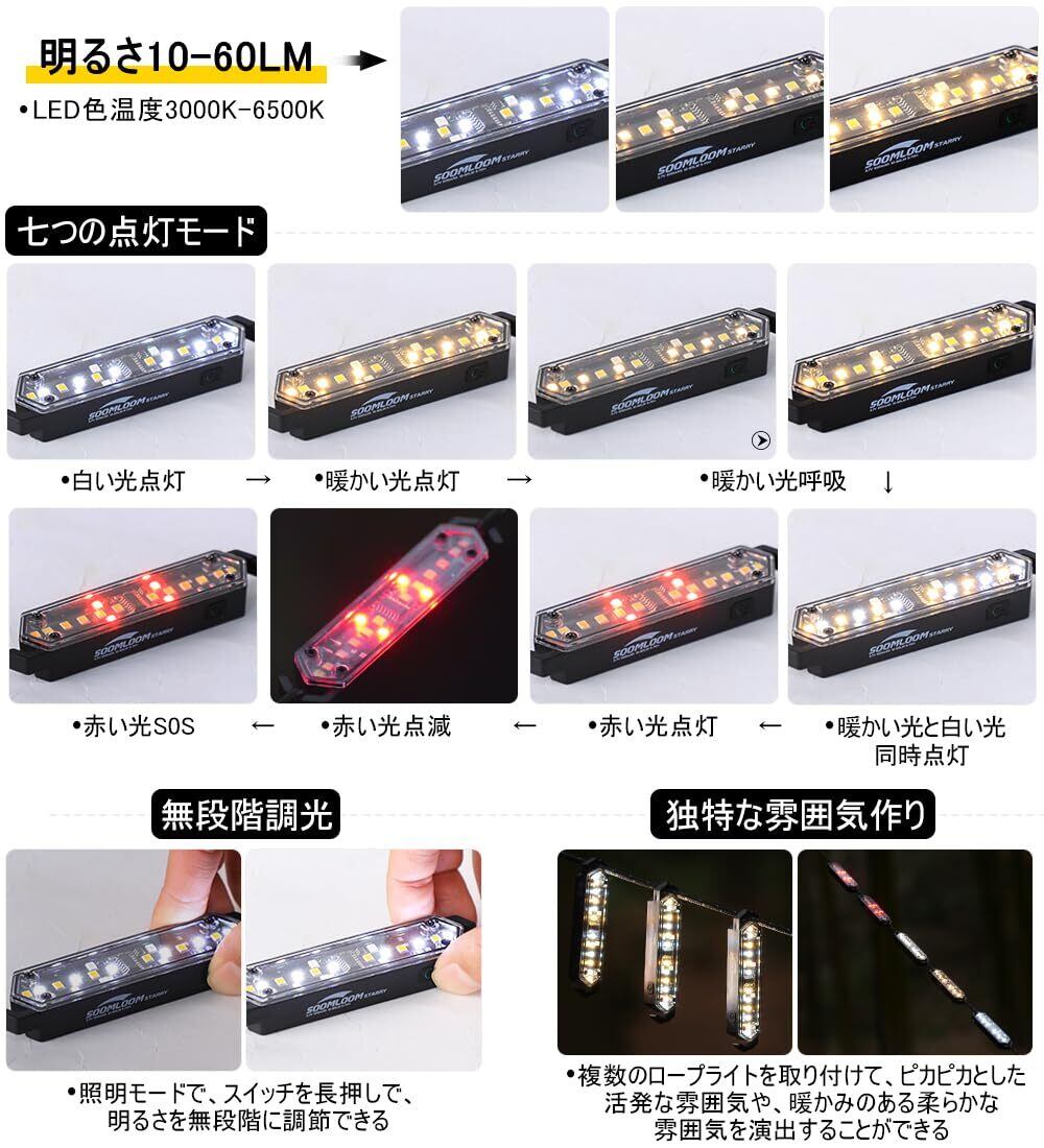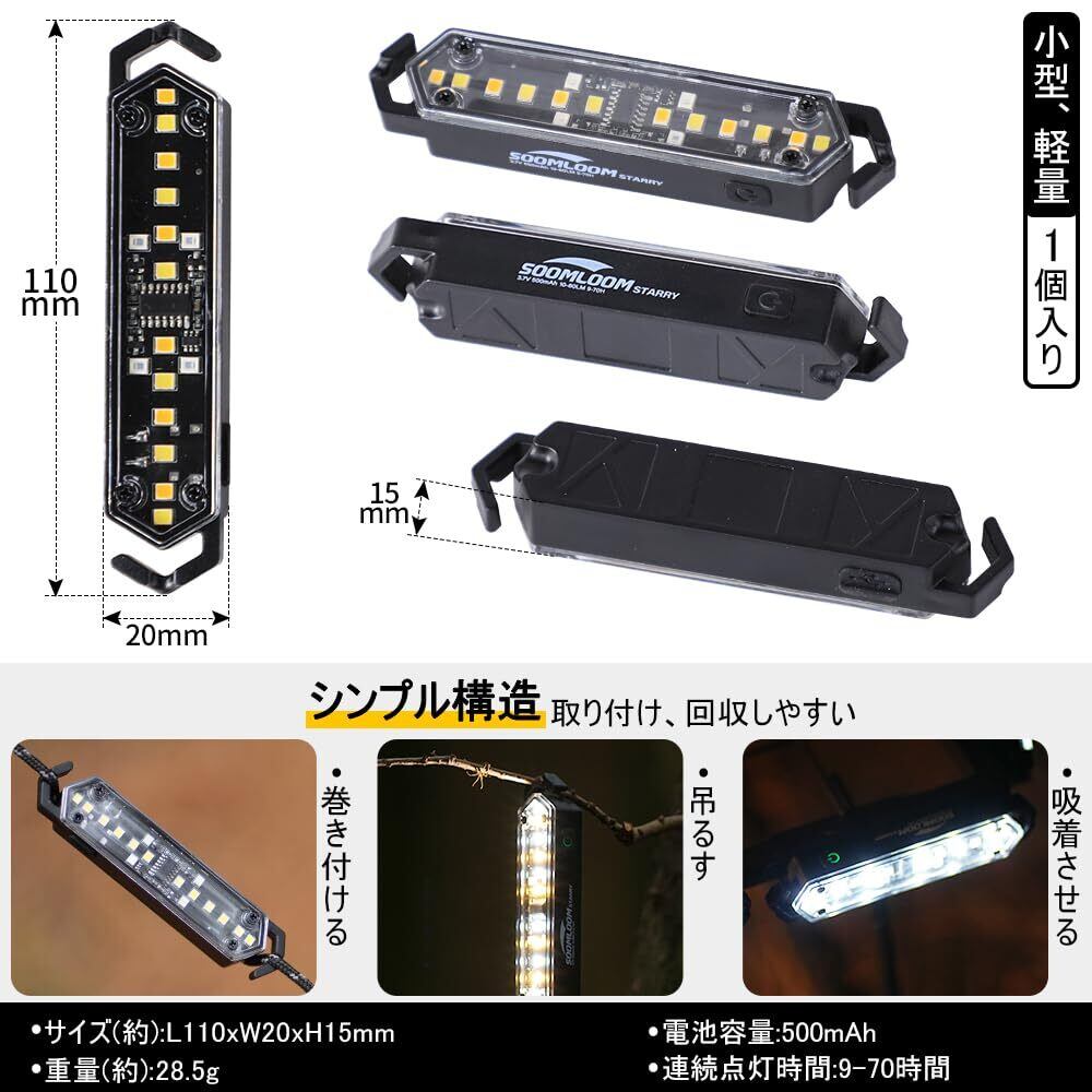 SoomloomガイロープLEDライトStarry充電式9-70H長時間連続点灯照明転倒防止視認性向上ランプ防水軽量雰囲気作り磁石内蔵USBType-Cキャンプアウトドア夜間テントタープ設営ロープLEDランプ