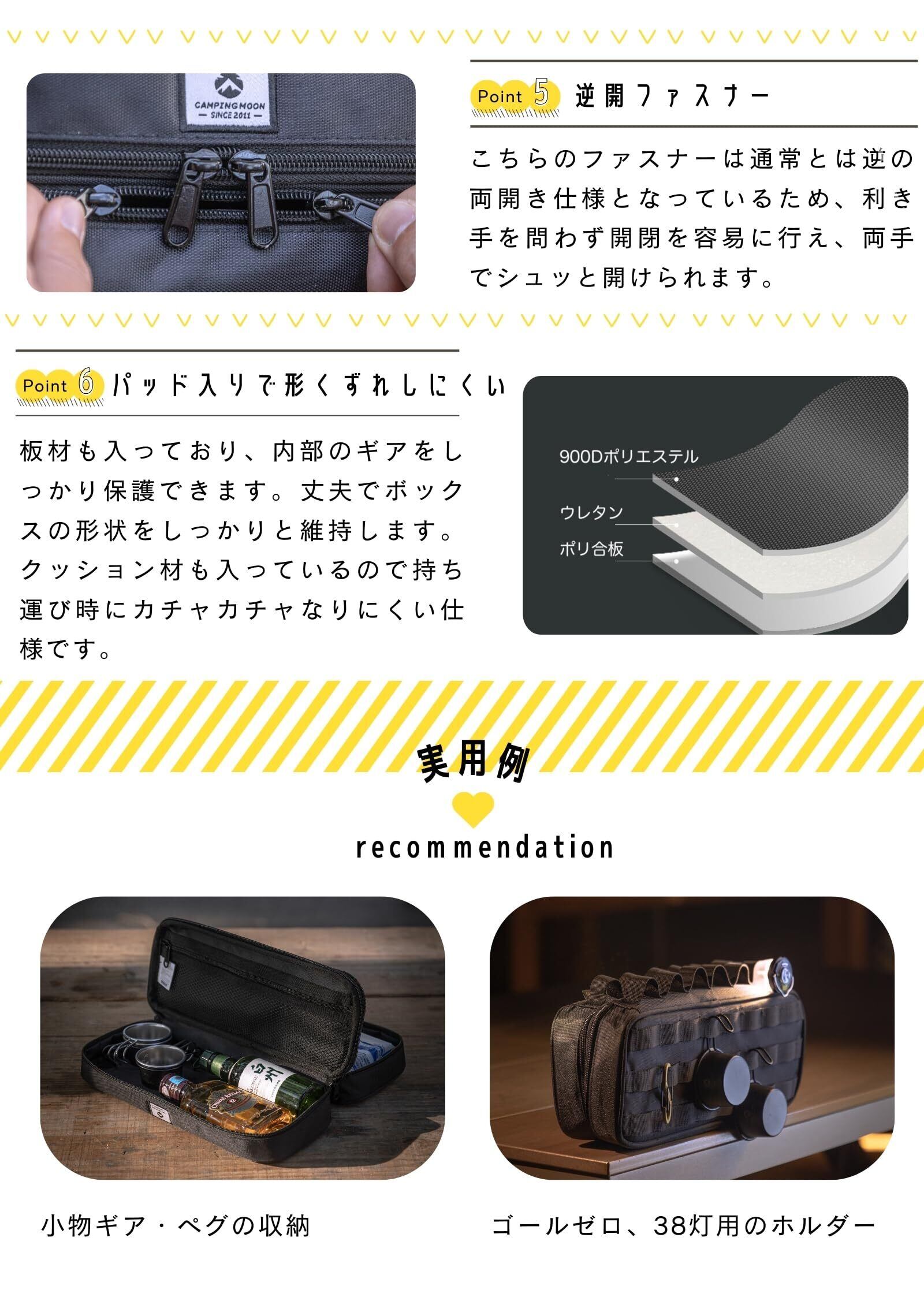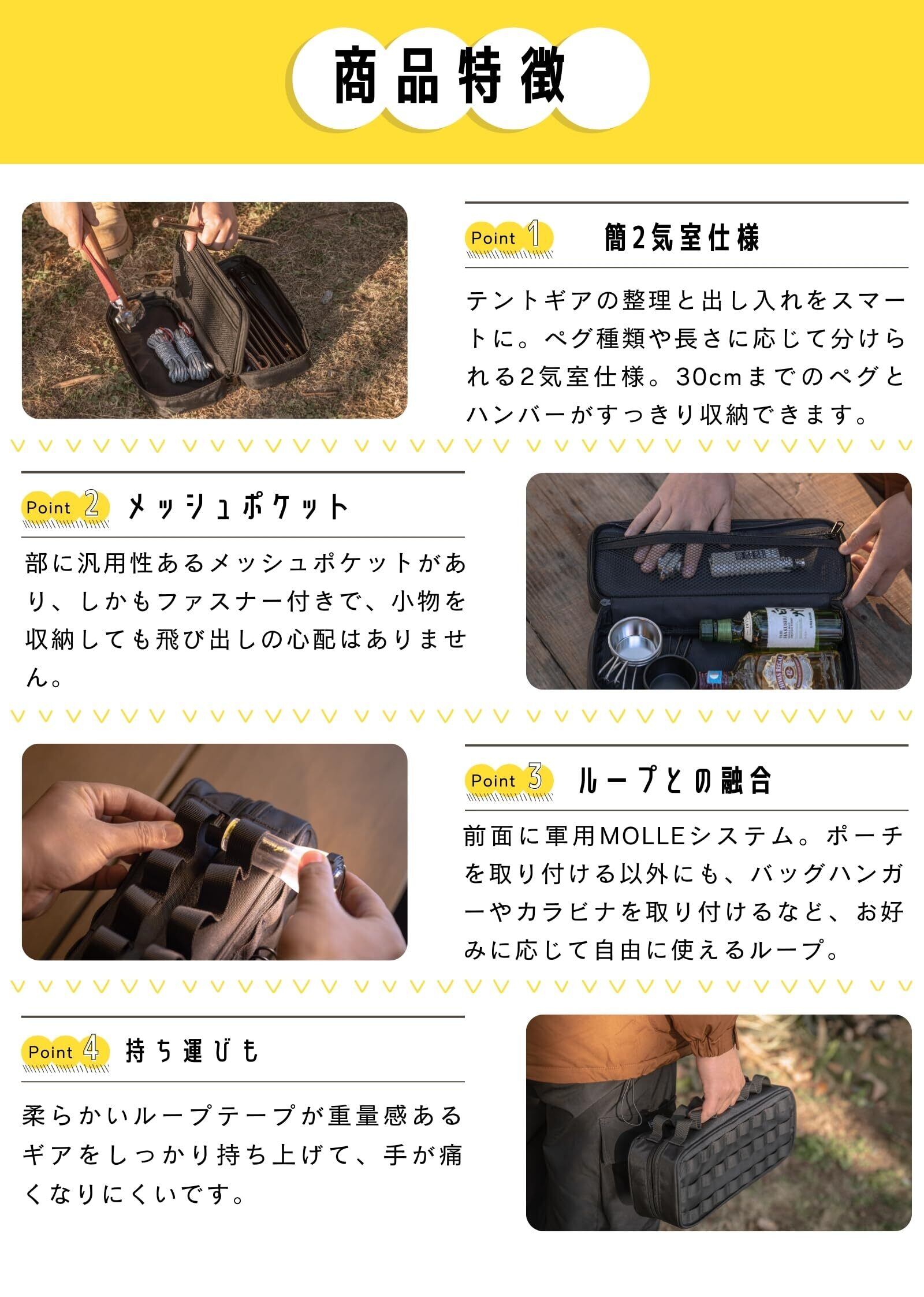 用途:長さが30cm未満のギア収納用。ジッパーをパカーンと開くと、仕切りメッシュポケットが現れます。ペグを取り出しやすいようにファスナーをパカーンと開けることができます。 前面に軍用MOLLEシステム。カラビナを通せるので、多彩な使い方ができるので 使い方自由自在。