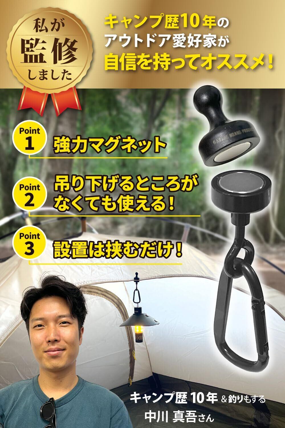 ■【キャンプの新しいスタンダード!】このランタンフックは、現役キャンパーの監修により開発された商品です。強力なマグネットを搭載しており、テントやタープにしっかりとランタンを固定できます。これで夜のキャンプがより便利で楽しくなります!