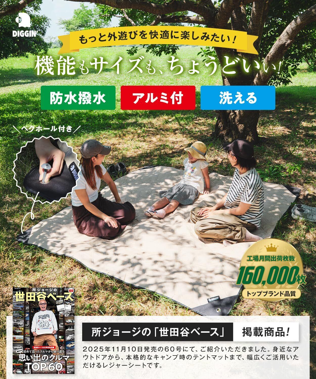 【所ジョージの世田谷ベース掲載】 DIGGIN' 洗える レジャーシート 大判 厚手 コンパクト テント内マット 防水 撥水 200x200 ピクニックシート キャンプシート アウトドアシート テント インナーマット キャンプ ラグ 【ペグ・収納袋付き】
