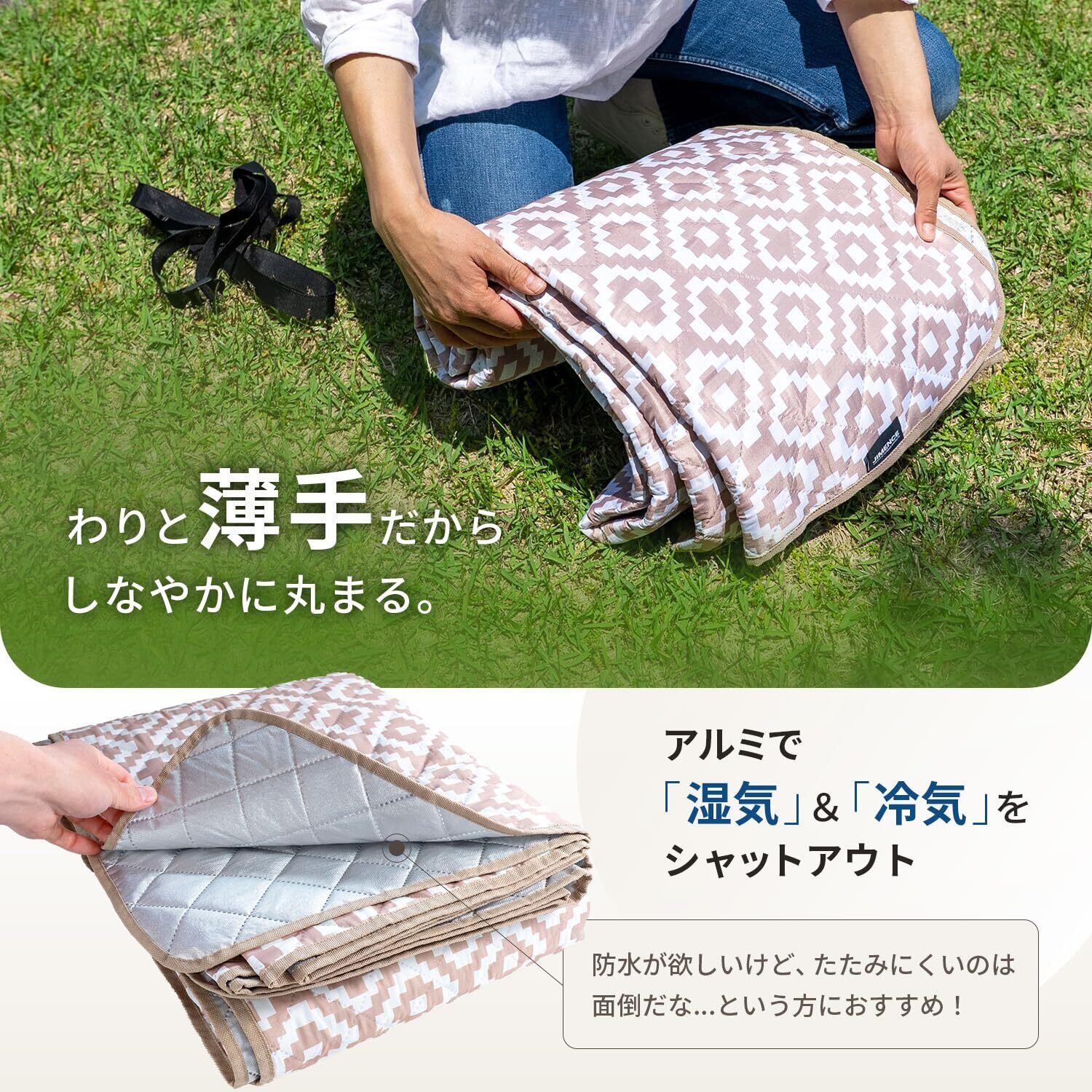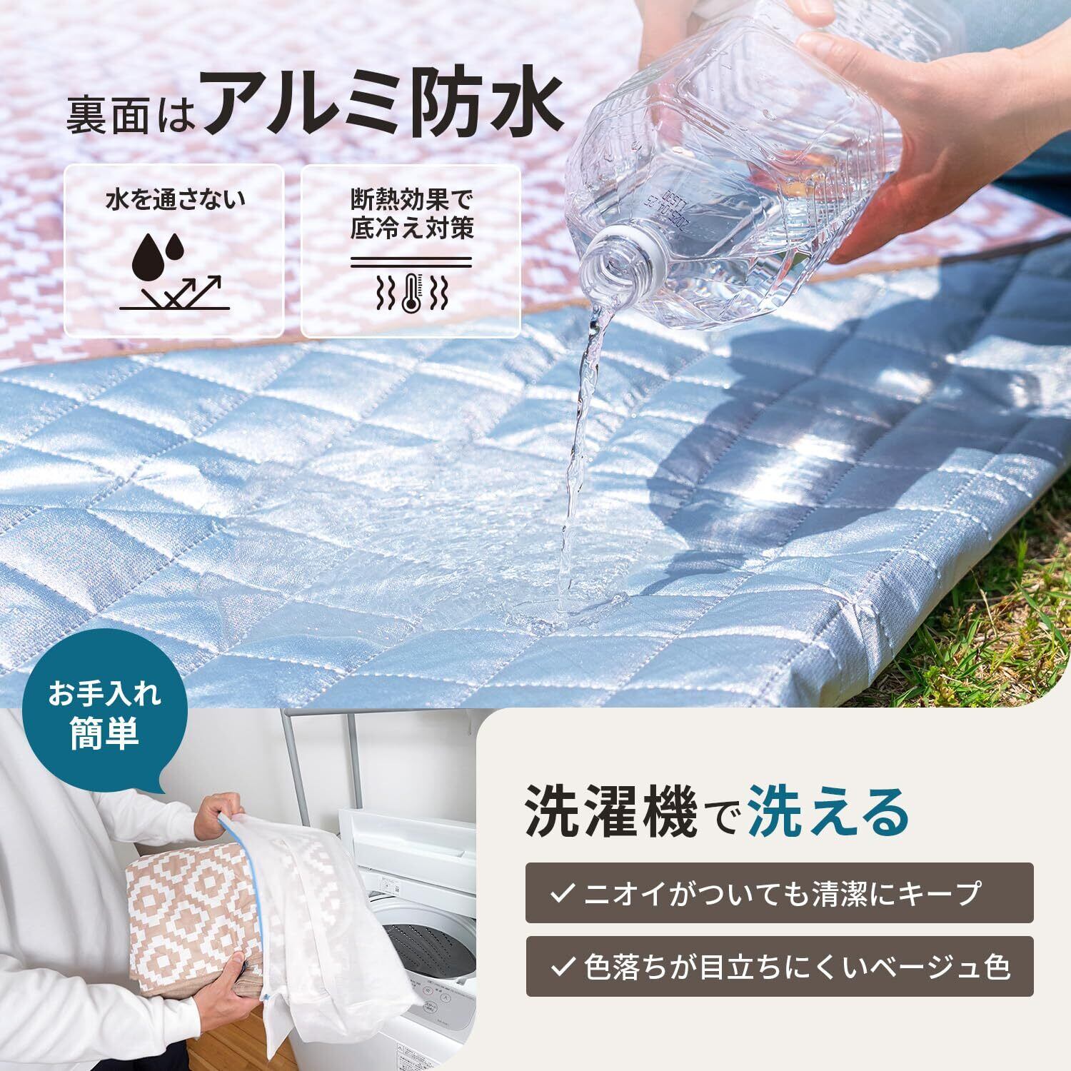 ■【防水&アルミ蒸着で安心!】特殊なアルミ蒸着素材を使用しており、防水性に優れています。地面からの湿気をしっかりと防ぎ、安心して使えるシートです。汚れた場合も簡単に拭き取れるため、お手入れもラクラクです。