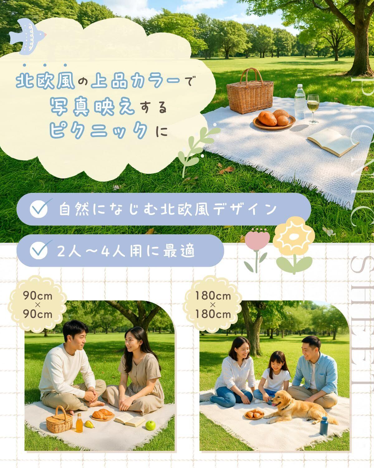 【写真映えするレジャーシート】サイズは2種類からお選びいただけ、いずれも1~4人用です。使いやすく、ピクニックやアウトドアで大活躍します。