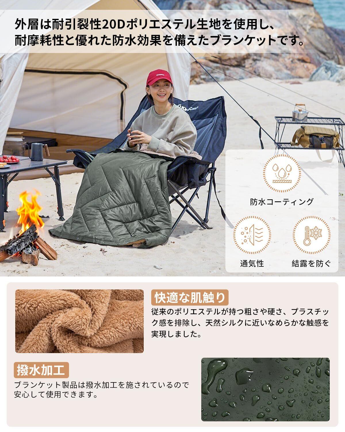 肌触り&防風防水の両立:ブランケットは表地が20Dポリエステルで軽量で防風、撥水加工が施され、野外での使用も安心です。裏地のフリースは厚手で暖かく、なめらかな手触り、肌に直接触れても快適です。