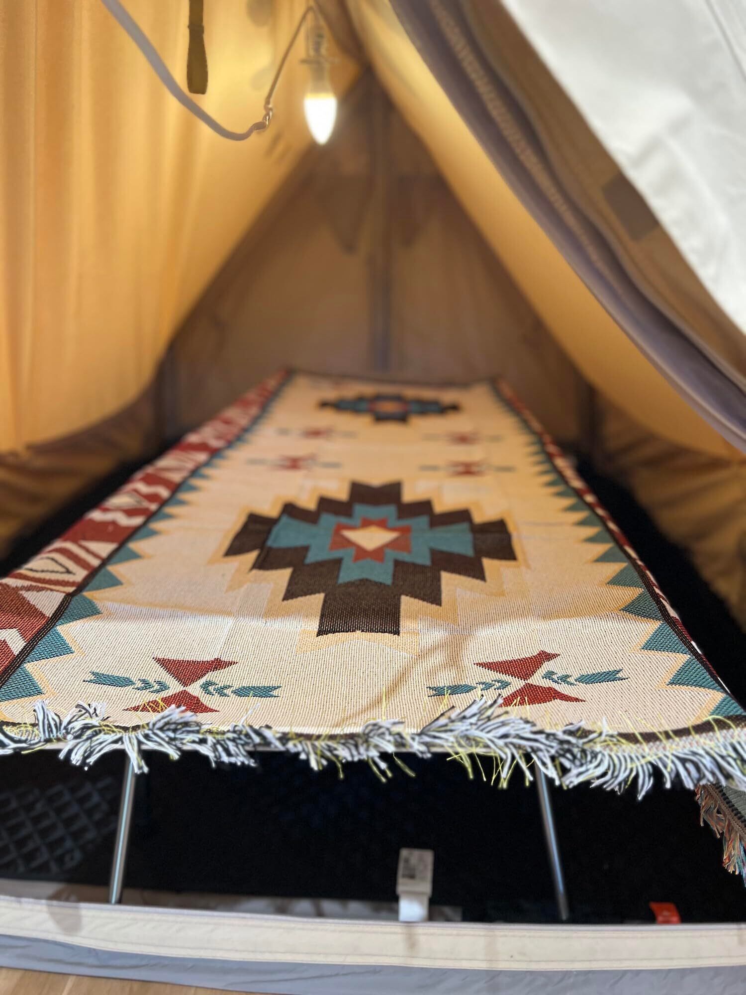 テーブルクロスとして活用しているキャンパーもたくさんいます。アンティーク調のキャンプ用品を置くことで、気分はネイティブアメリカン!