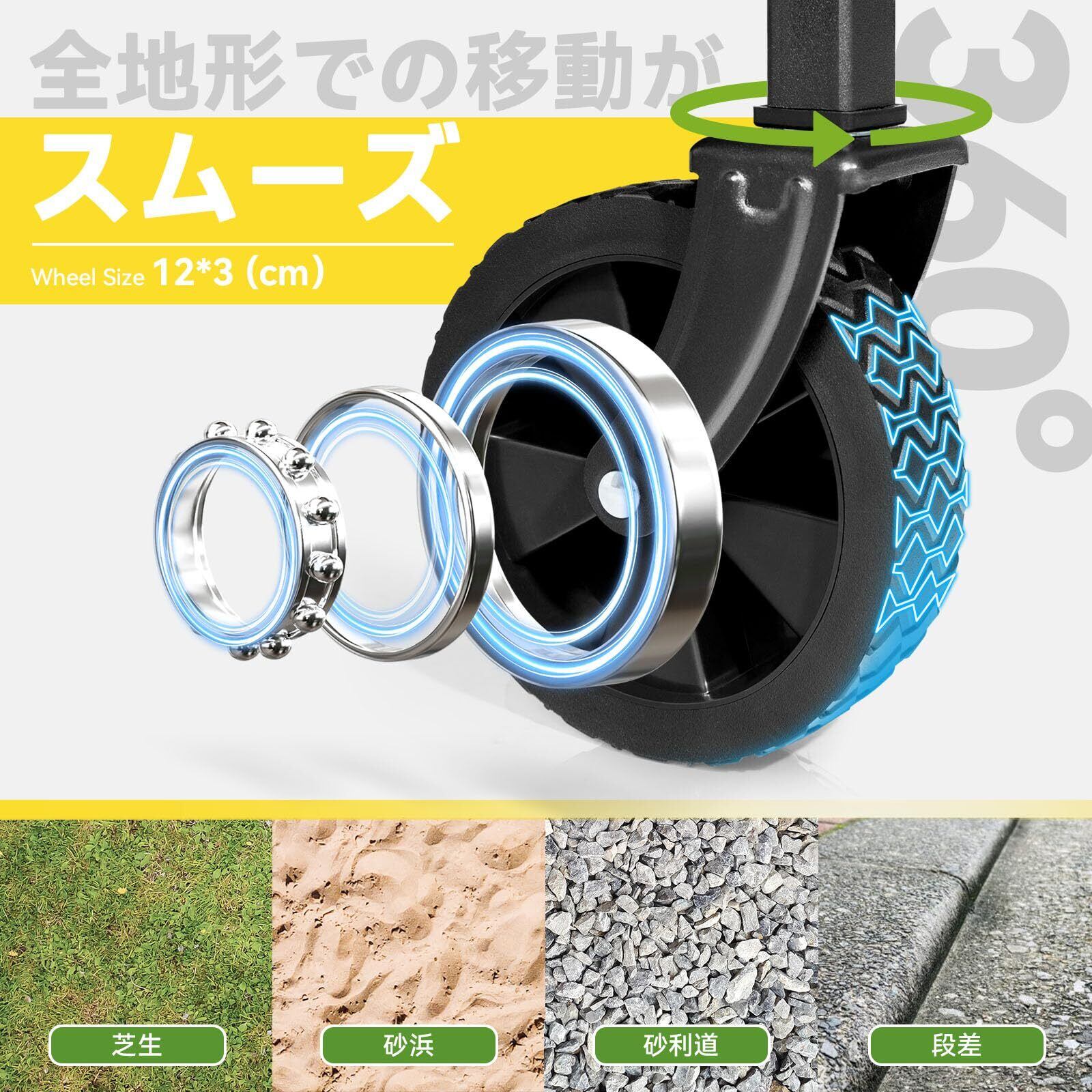 「360°回転キャスター・自動復帰ハンドル」 360度回転する前輪とスムーズなベアリングにより、操作が非常に簡単で、エレベーターや狭い通路でも軽快に移動できます。タイヤは幅3cm、直径12cmで安定した走行をサポート。さらに、多角度調節可能なハンドルと3段階調整可能な高さ(42cm〜75.5cm)により、最適なポジションで快適に使用できます。自動復帰機能付きで、運搬時の操作性と快適性を大幅に向上させます。