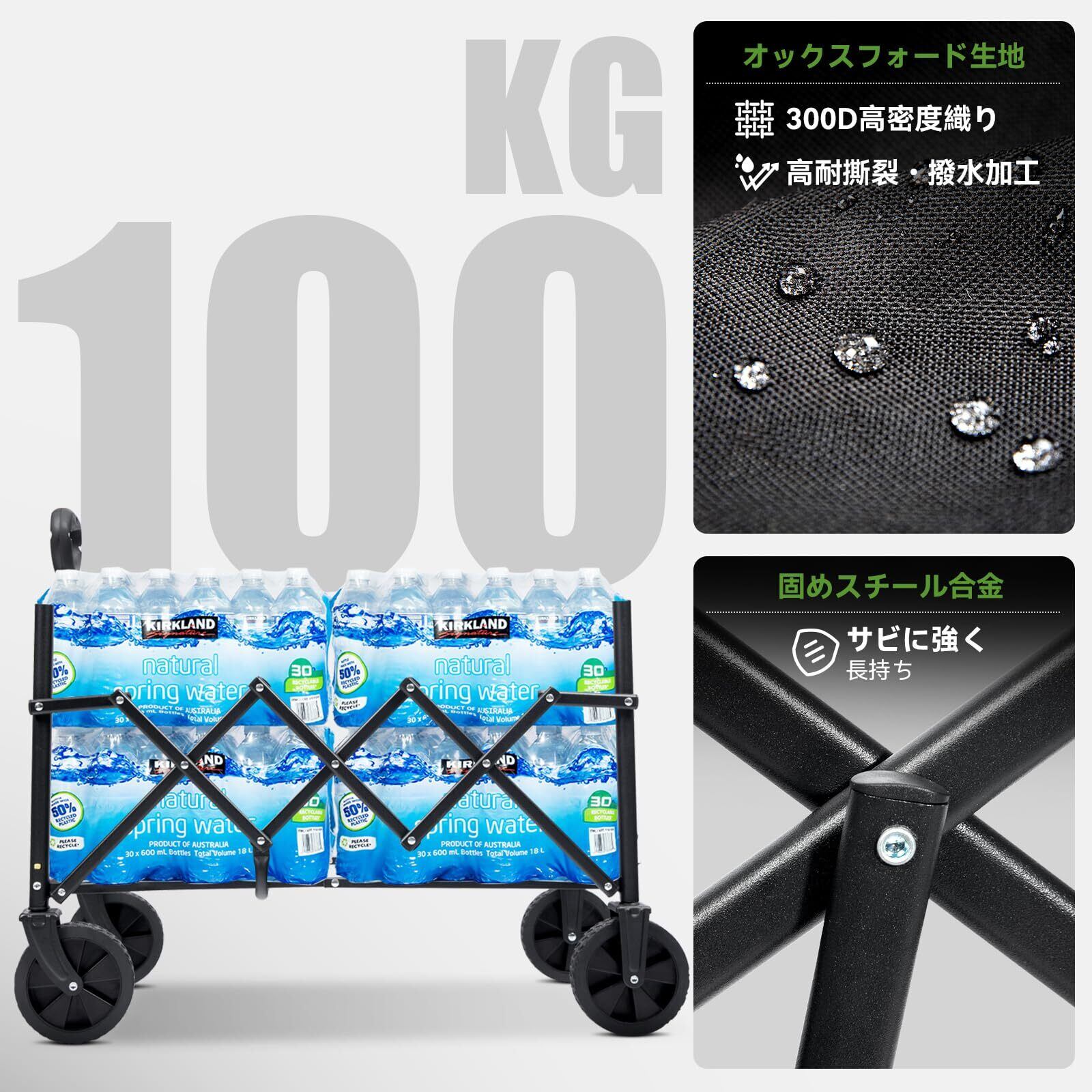 「高耐荷重構造・圧倒的な大容量」 100kg(成人体重相当!)の静荷重&80kg動荷重対応で、キャンプ・公園遊び・まとめ買いにも最適なプロ仕様設計です。16点連結フレームで荷物を均等に分散し、安定性抜群。耐荷重上限まで重りを載せた場合でも、重さをそれほど感じることなく円滑に移動できます。堆積容量は最大120Lで、荷台部のサイズはL60.5 × W36× H27.5cmです。