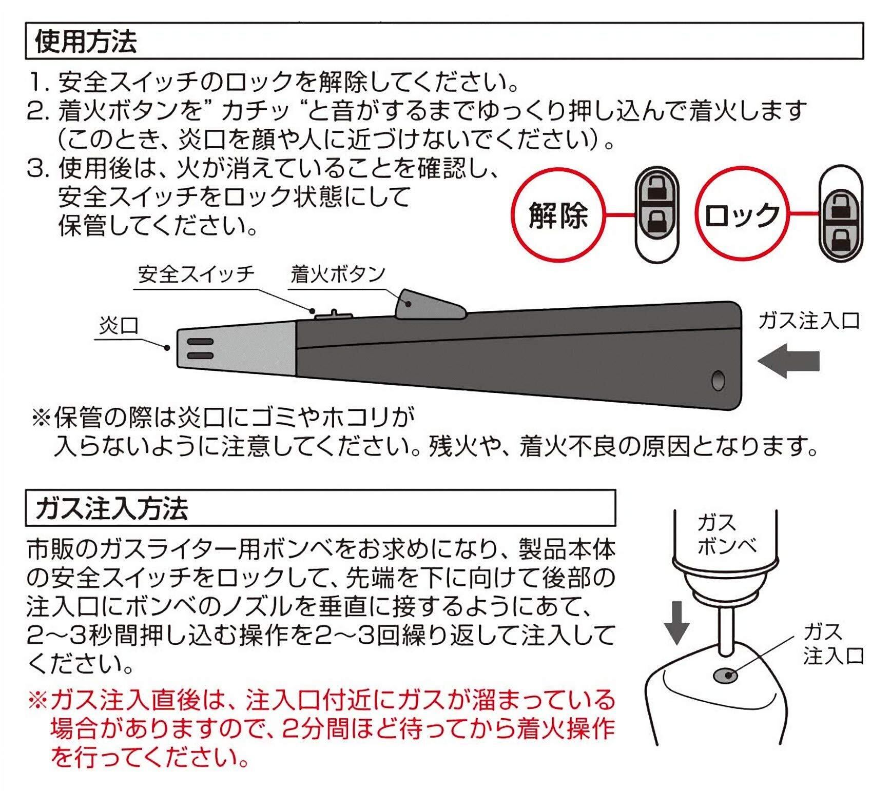 期間:購入日より2年間、特徴:ソフトな操作感。女性や高齢の方も使いやすい点火ボタン。置く場所を選ばないインテリア性の高い点火棒。立てて置ける。レジャーや花火はもちろん、ご家庭や仏壇、お参り用にも。繰り返し使える。ガス充填式。