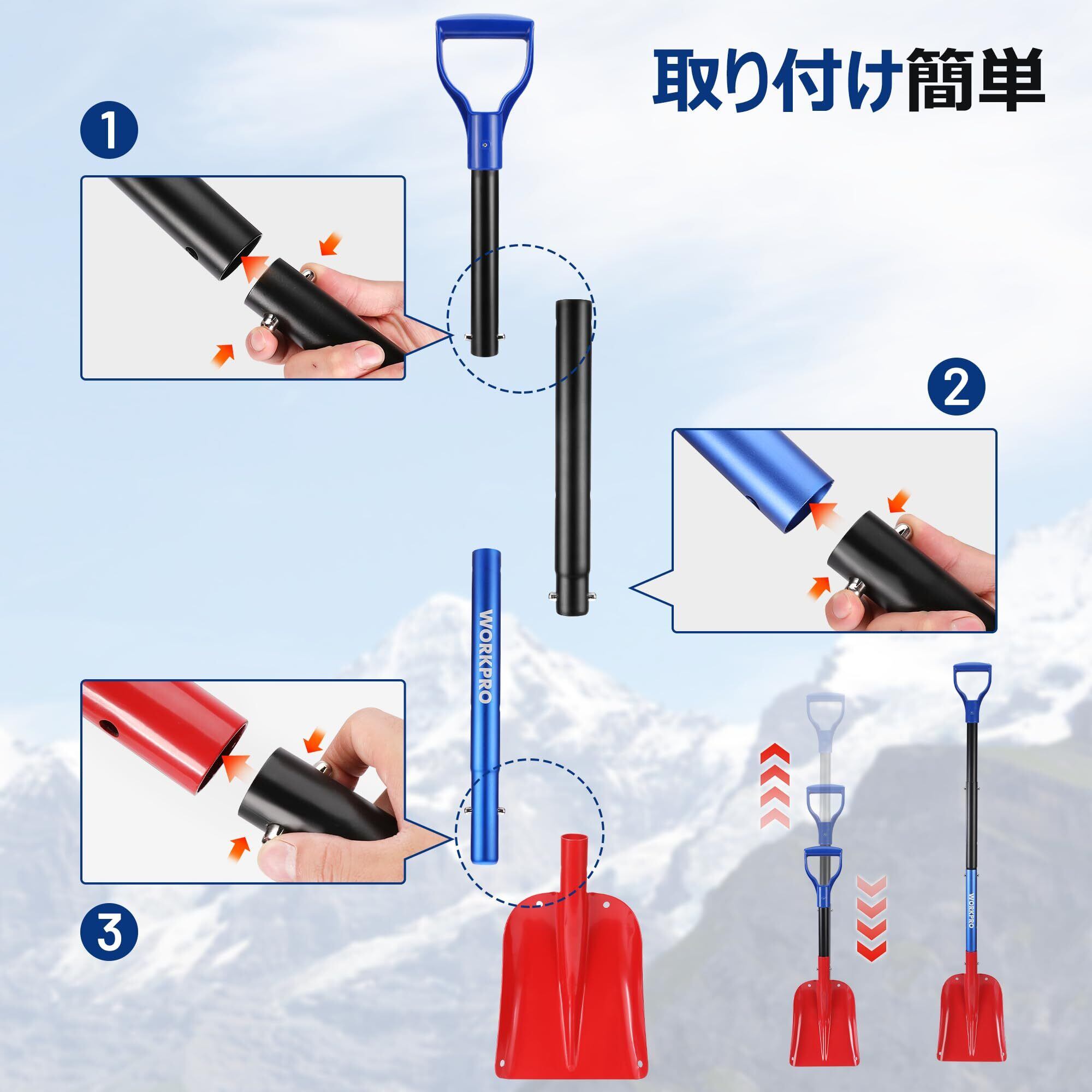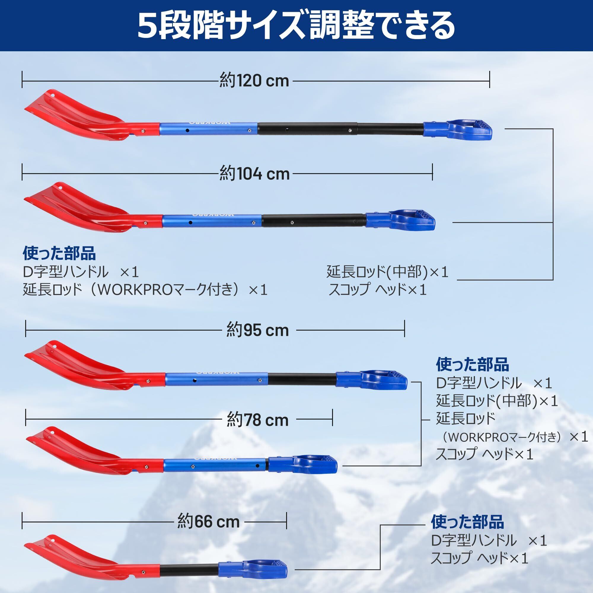 ■【多段階調整で使いやすい!】WORKPROの雪かきスコップは、5段階に調整可能な伸縮式の設計です。使用シーンや体格に合わせて自由に長さを調整でき、ストレスなく作業を進めることができます!