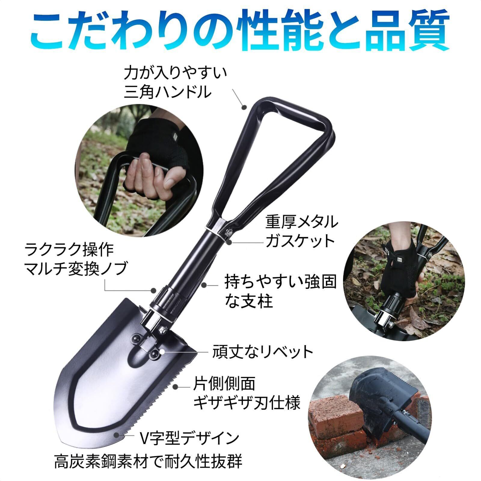 【説明】アウトドアやガーデニングに理想的なマルチツールスコップです。頑丈で小型かつ軽量なデザインは、ショベル、土堀り、穴掘り、雪かきなど、様々な用途に対応します。折りたたみ可能で車載に最適、非常時の災害対応にも頼りになります。