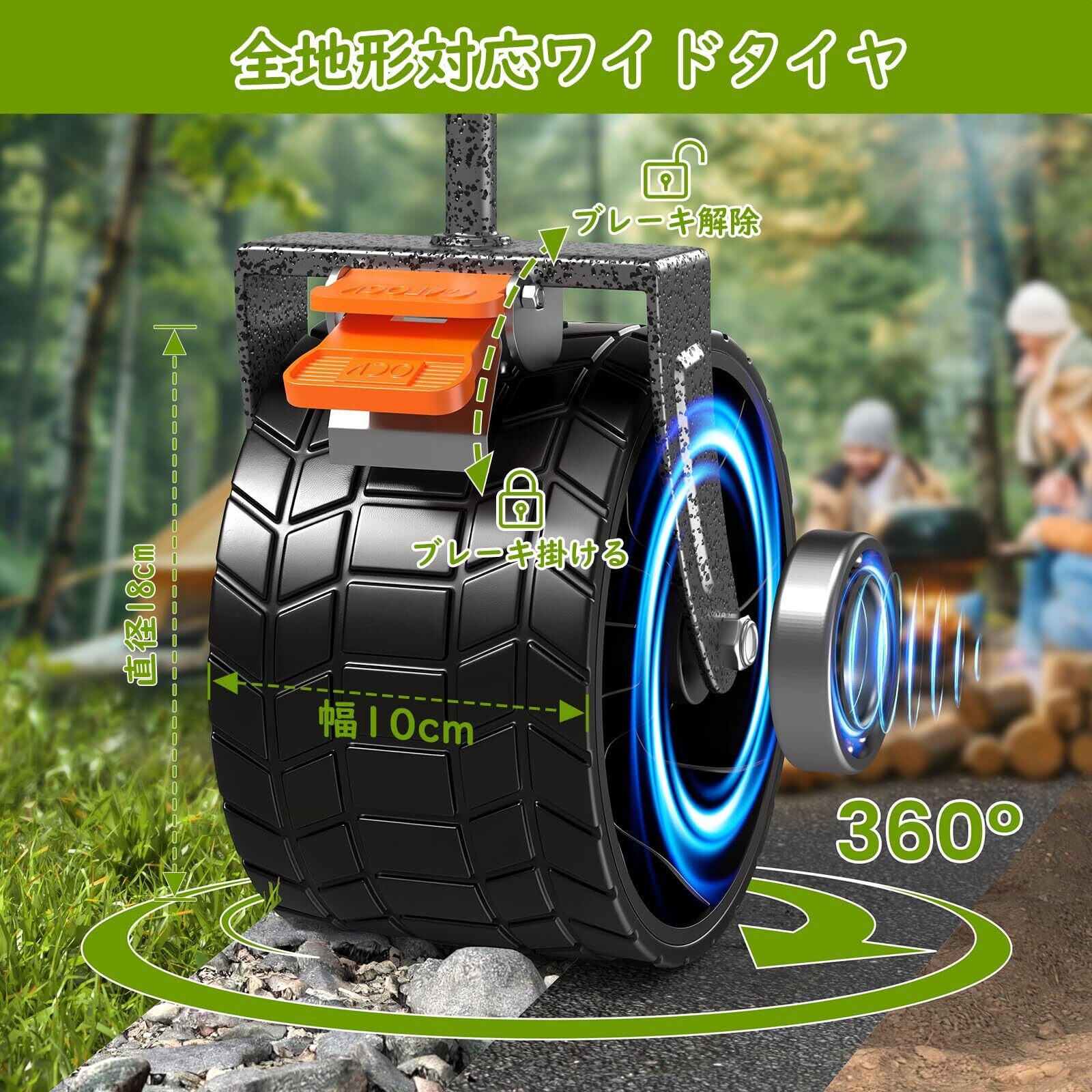 ■【安定した走行&ブレーキ機能!】特別に設計されたブレーキ付きで、急な坂道でも安心して使用できます。360度回転するタイヤが、どんな地形でもスムーズに走行可能。砂浜や草地、険しい道でも、安心して荷物を運ぶことができます。