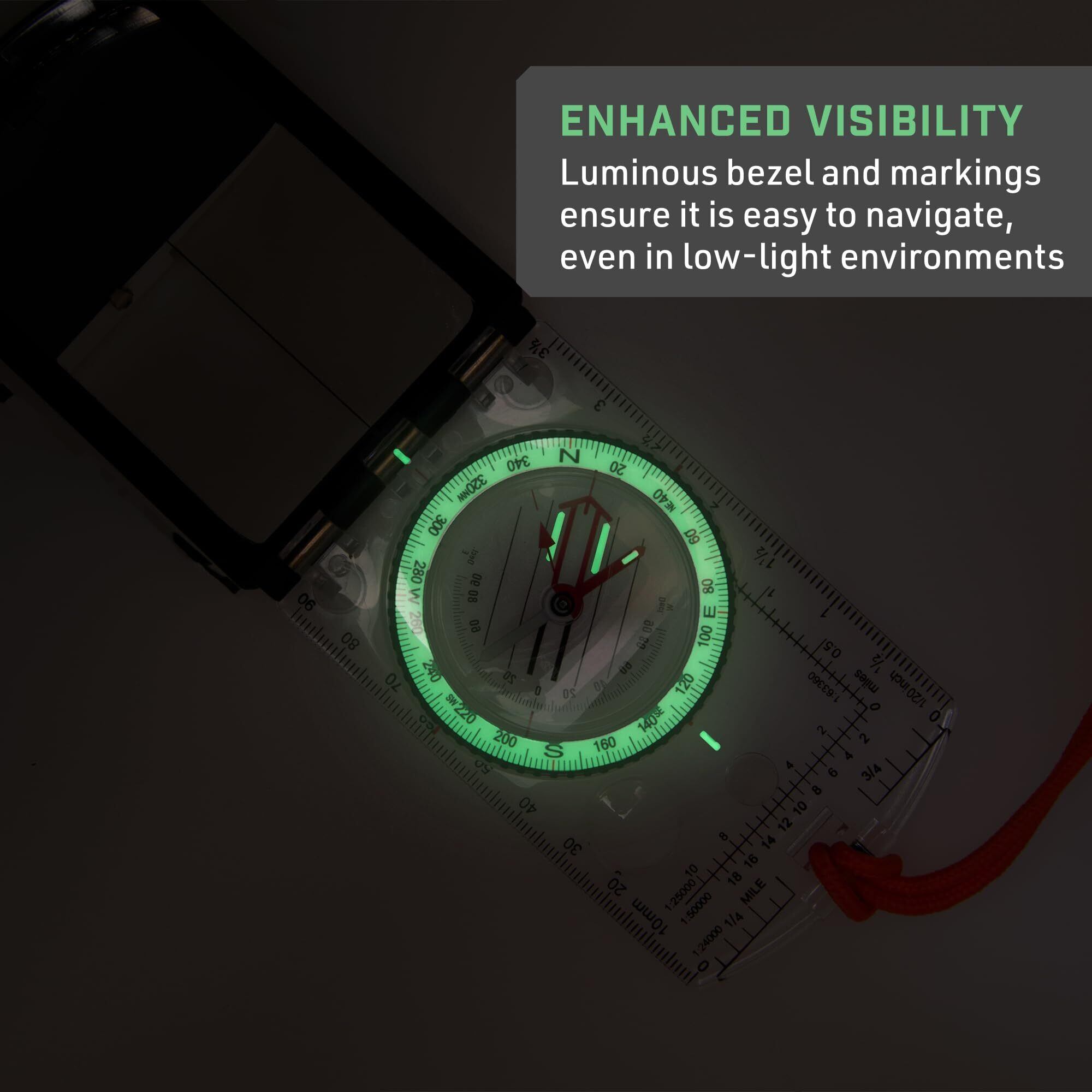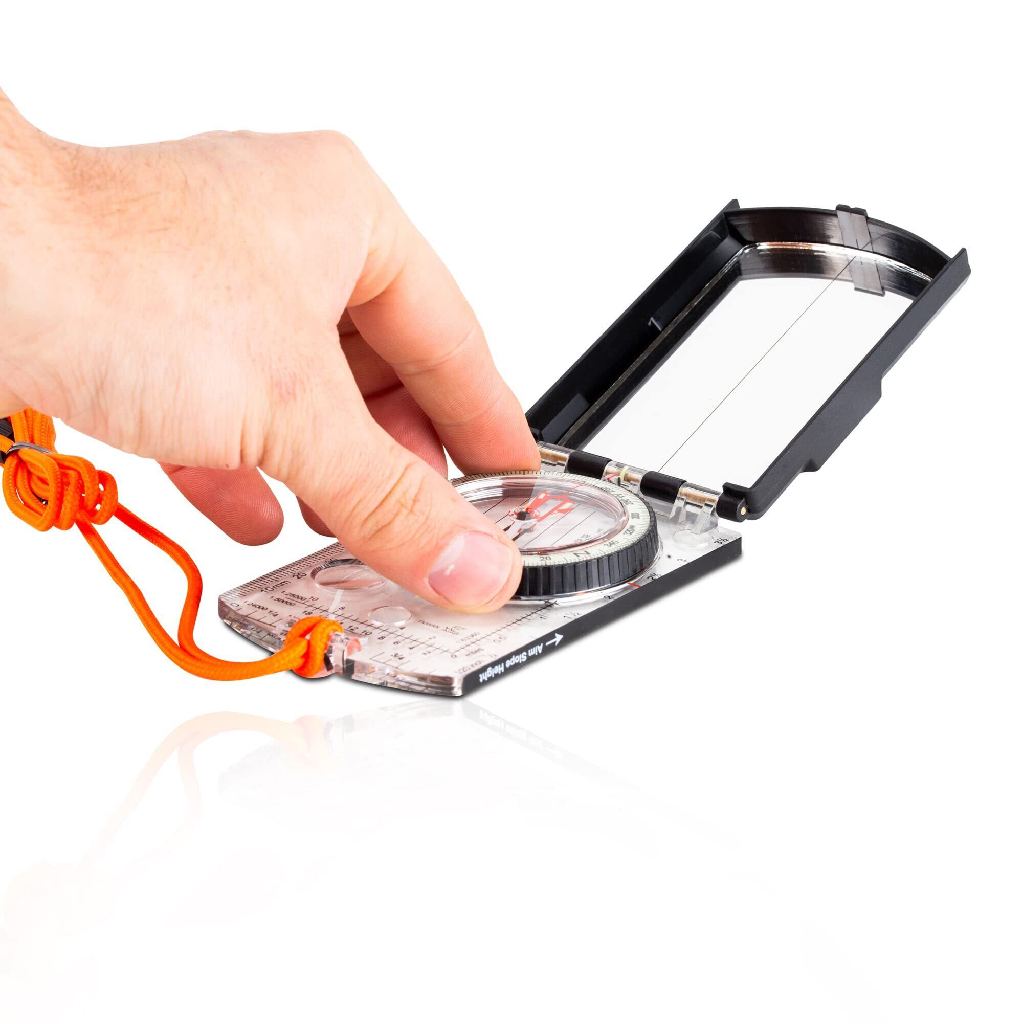 その他の機能 - 他に、宝石軸受け、3倍尺の拡大鏡、4つの地図縮尺、インチとミリメートル単位による物差し、ブレイクアウェイ安全ランヤード、シリコン製の滑り止め足パッドが含まれます。サバイバリスト、ボーイスカウト、大人も子供も、全ての人に最適なマップコンパスです。"