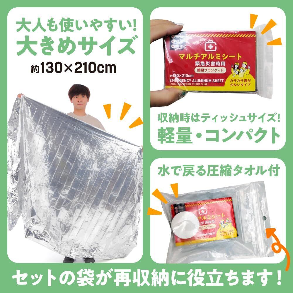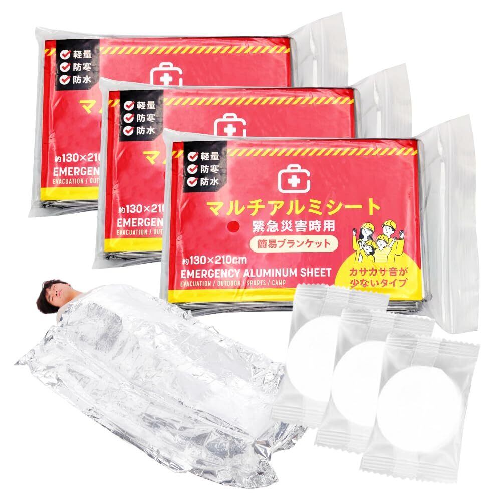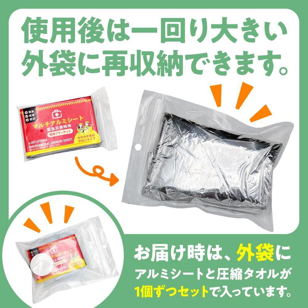 【使用上の注意】大変燃えやすい素材ですので、火気に近づけないでください。また、頭部はアルミシート(サバイバルシート)で覆わず、通気を保つようにしてください。雨や高温環境での使用時には、シートの折り目からアルミ箔が剥がれることがあります。材質:アルミ二ウム、低密度ポリエチレン ※サバイバルシートの使用期限は購入後5年です。 圧縮ペーパータオル:38cmX25cm パッケージサイズ:20X14cm