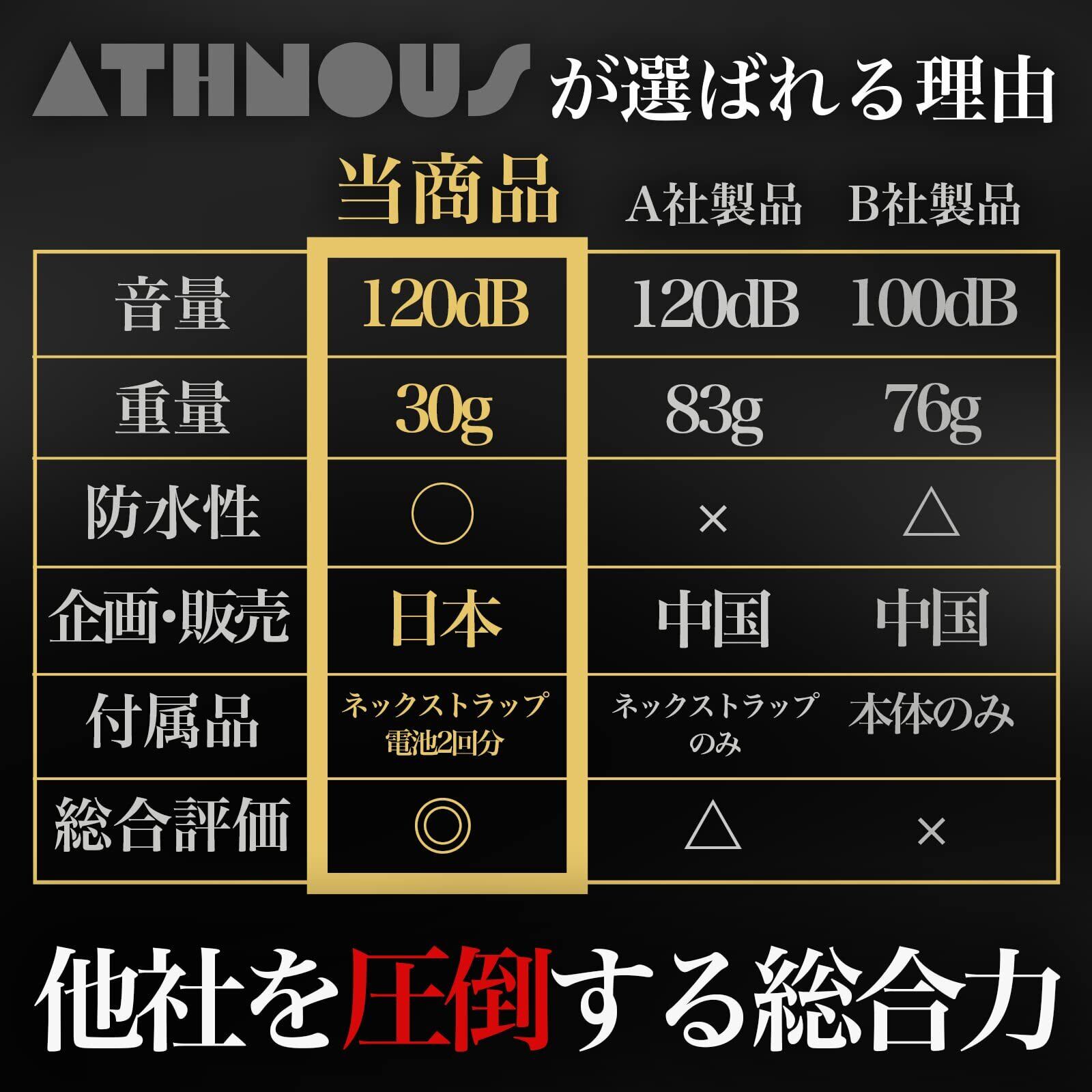【特別価格】ATHNOUS(アスナス) 電子ホイッスル 防水 防災 防犯 熊除け 超軽量 大音量 コンパクトデザイン 害獣除け 審判 登山 キャンプ LEDライト付き 2回分の電池付属 ネックストラップ付属